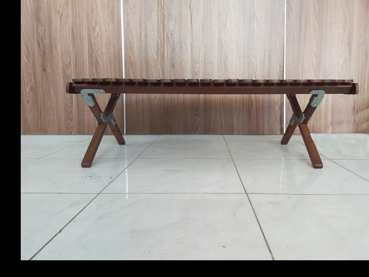 Thiết kế chân bàn hình chữ X chéo nhau nhìn vào rất mạnh mẽ chống trã với thiên nhiên, mặt bàn như một phiếng lá mở rộng khi mở chúng ra khép vào chỉ còn