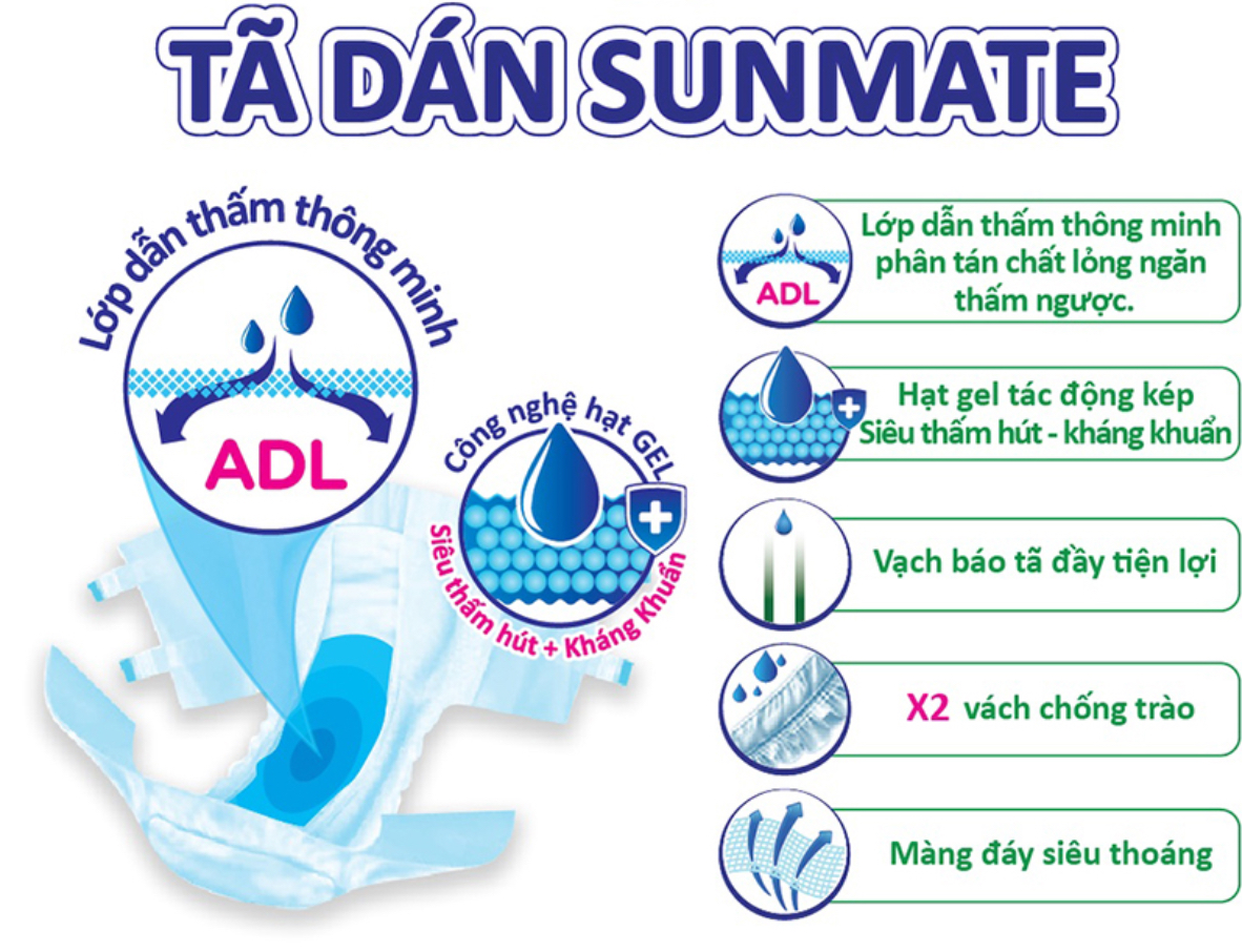 Mua tại TiktokChứa hạt siêu thấm, khả năng kháng khuẩn khử mùi Tã Dán Người Lớn SunMate có chứa hạt siêu thấm công nghệ mới, rất hiệu quả trong việc thấm hút, giúp ngăn ngừa tình trạng hăm tã và kích ứng da. Ngoài ra, khả năng kháng khuẩn khử mùi giúp giảm thiểu mùi khó chịu, thân thiện hơn với người dùng Thiết kế thông minh Tã Dán Người Lớn SunMate có thiết kế thông minh, giúp việc chăm sóc người cao tuổi nhẹ nhàng hơn. - Hiển thị ẩm ướt: báo hiệu bạn đã để lúc thay tã mới khi phần mực in phai màu - Vách ngăn chống tràn: giúp ngăn chất lỏng rò rỉ ra hai bên - Số hiển thị kích cỡ: giúp dễ dàng nhận diện kích cỡ để điều chỉnh cho vừa vặn. - Khóa dán kép: giúp bạn dễ dàng điều chỉnh cho vừa vặn có thể dán đi dán lại nhiều lần.