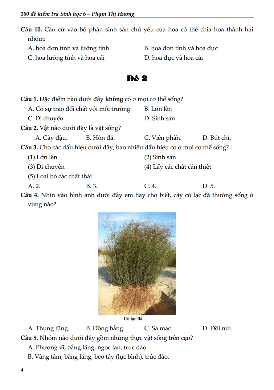 Mua tại TiktokĐể tạo điều kiện cho học sinh dễ dàng học tập và vượt qua những bài kiểm tra môn Sinh học lớp 6, giúp các thầy cô giáo và các bậc phụ huynh có thêm tài liệu hướng dẫn học sinh và con em mình học tập, tôi biên soạn cuốn: 100 Đề Kiểm Tra Sinh Học 6. Sách được biên soạn bám sát chuẩn kiến thức, gồm nhiều câu hỏi hình ảnh giúp học sinh hứng thú trong học tập. Ngoài ra còn những câu hỏi thực tế, vận dụng, mở rộng, phát huy được tính tích cực và tinh thần học tập của học sinh. Sách được viết theo 3 loại đề kiểm tra trong chương trình Sinh học 6. Cụ thể được thiết kế như sau: A. PHẦN I – HỌC KÌ I