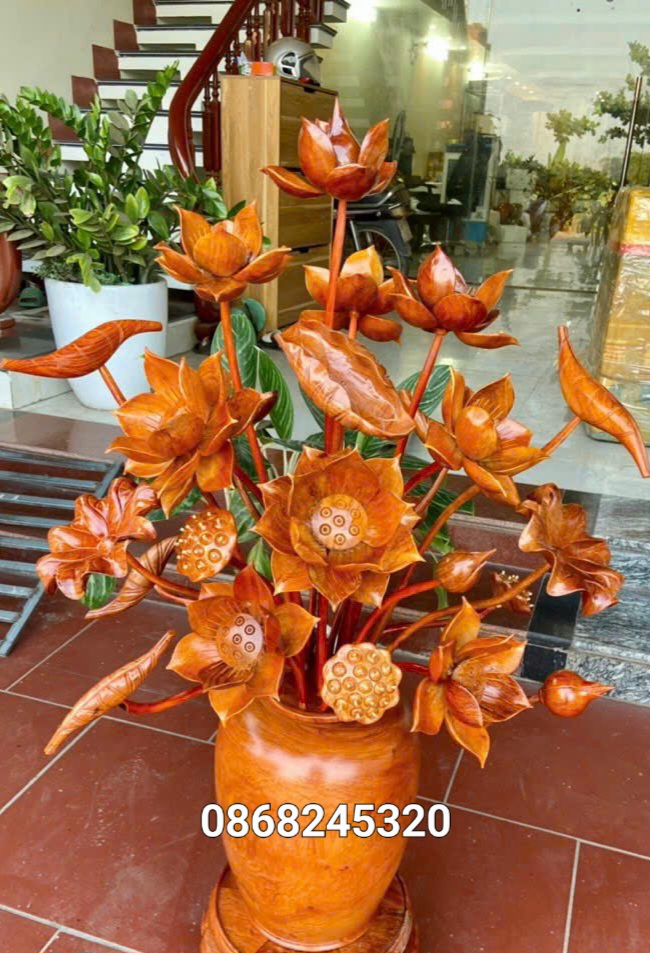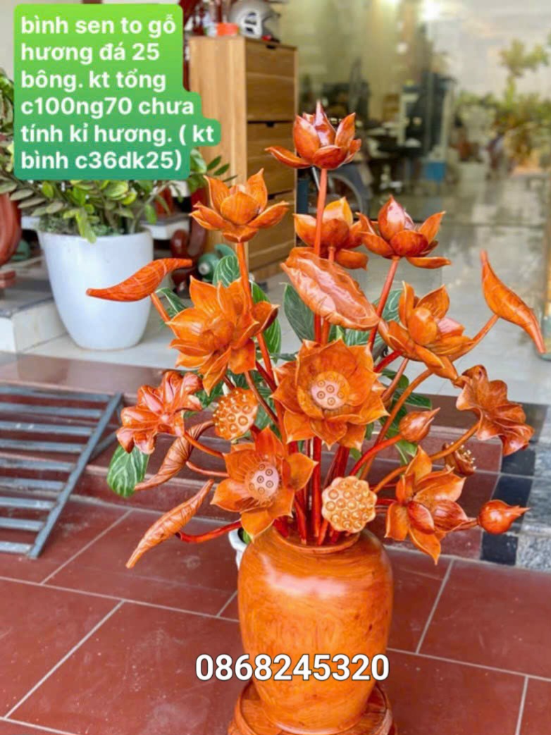2 bình hoa sen 25 bông  phong thủy trang trí phòng khách phòng thờ được làm bằng chất liệu gỗ hương đá  tự nhiên 100% Kt bình cắm hoa cao 36×25cm + hoa lá gương cao tổng 100 xòe rộng 70cm chưa tính kệ  _ Bình hoa sen được tiện khắc tỉ mỉ ,tinh xảo kỳ công .Đi hầu hết tất cả mọi chi tiết góc ngách nội dung hoa văn của bình hoa sen đều được gọt tỉa chỉnh sửa sắc nét hoàn toàn bằng tay thủ công .Đồng thời bình hoa sen được kiểm định kỹ lưỡng khắt khe ,Như cho vào thẩm sấy cho gỗ kiệt .Mục đích chống dập nứt vênh mo mối mọt .Kết hợp với trà nhám đánh giấy giáp nhiều nước sờ mát lạnh .Song cho vào phun lót làm bóng mờ để giữ lại mầu sắc vân gỗ tự nhiên .Đẹp long lanh đẳng cấp như ảnh trên .Bình hoa sen được làm và hoàn thiện do bàn tay khối óc tài hoa .Từ những người thợ giàu kinh nghiệm ,cũng như tay nghề cao trong làng nghề truyền thống .