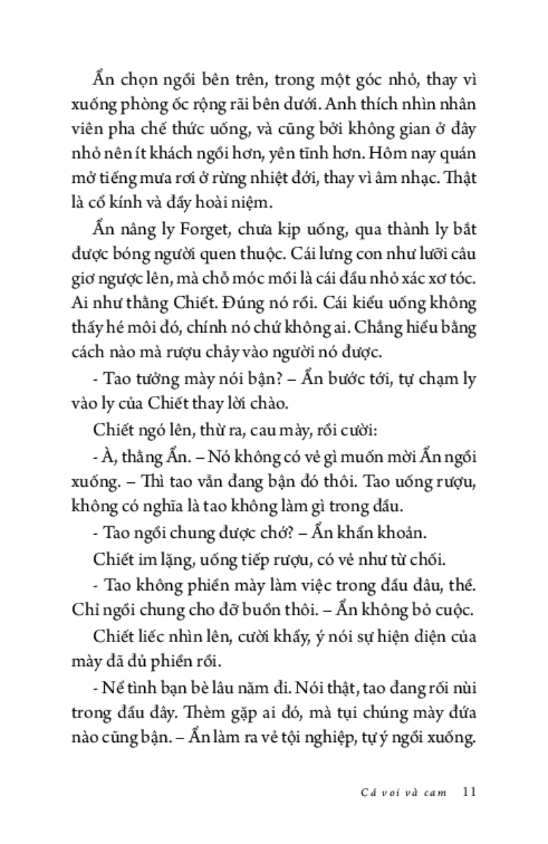 Ẩn không dám nhìn lên, anh chỉ muốn tránh bầu trời đẹp đẽ ấy, muốn nhanh nấp vào công ty để nhìn những trần nhà xám lạnh tẻ nhạt. Sự tẻ nhạt an toàn cố hữu, như triệu năm rồi vẫn vậy, có thể tìm thấy ở bất kì đâu trong kí ức: buồn chán và cứng ngắc. Còn hơn phải nhìn thấy bầy cá voi bơi giữa những trái cam, tất cả đều khổng lồ, tươi sáng và hiền hòa tới mức giả tạo.”