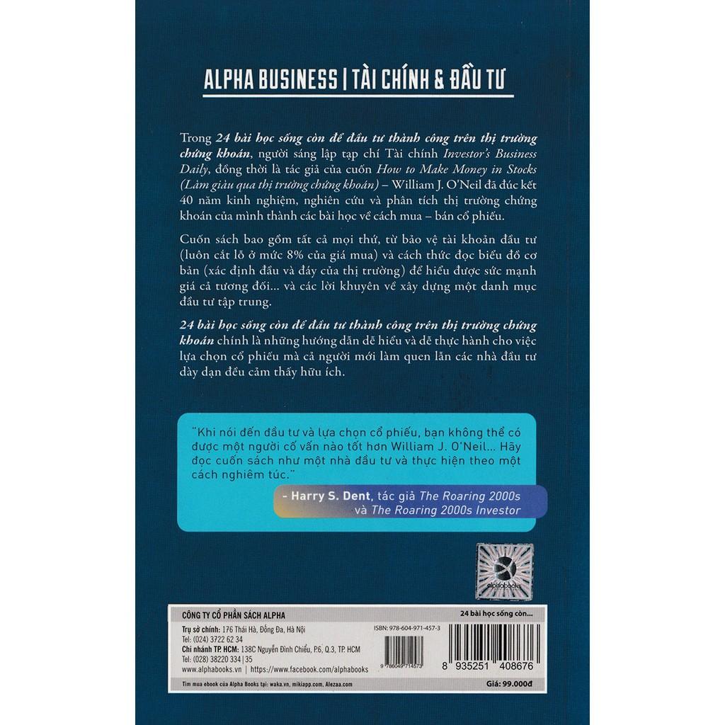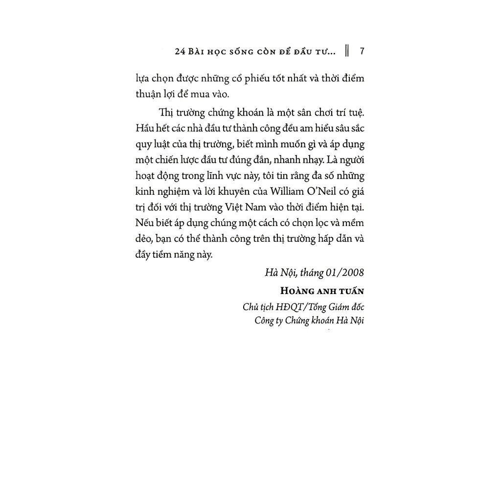 24 bài học sống còn để đầu tư thành công trên thị trường chứng khoán chính là những hướng dẫn dễ hiểu và dễ thực hành cho việc lựa chọn cổ phiếu mà cả người mới làm quen lẫn các nhà đầu tư dày dặn đều cảm thấy hữu ích.