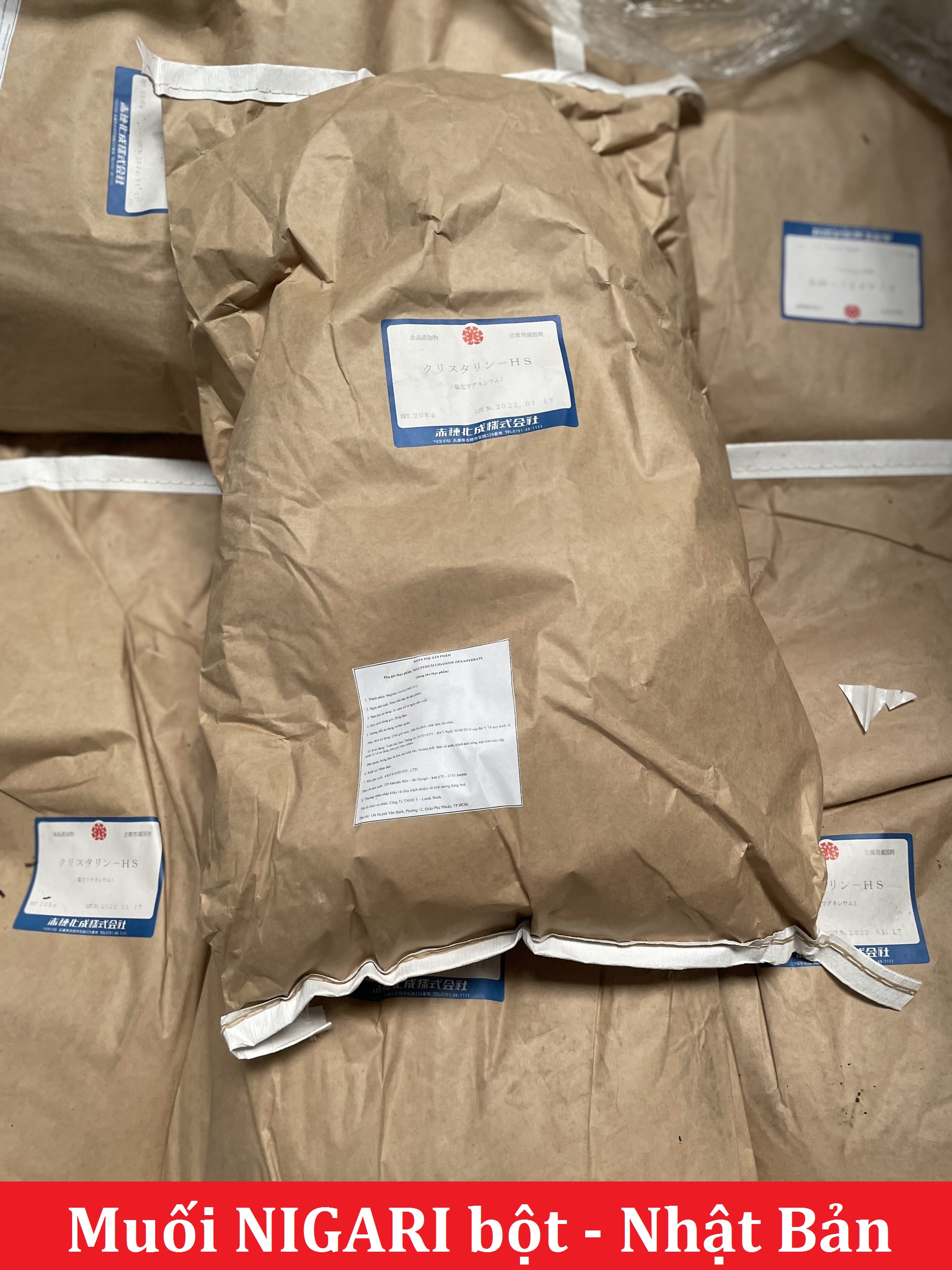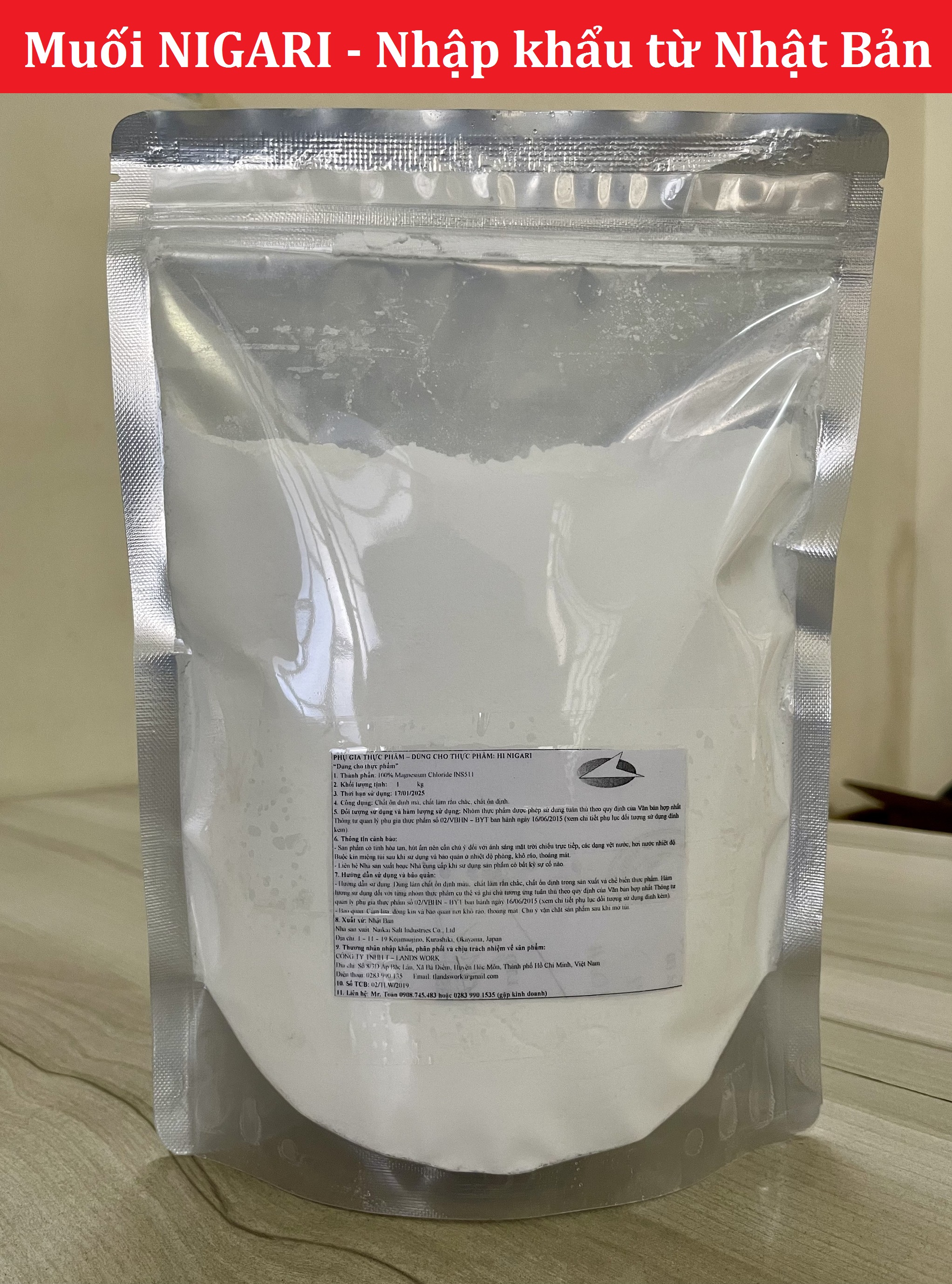 Thông tin về sản phẩm Tên thường gọi :Muối Nigari, muối Nhật, muối Nigari bột, muối làm đậu hũ Tên khoa học : MAGNESIUM CHLORIDE HEXAHYDRATE Thành phần : 100% Magnesi clorid (INS 511) Thành