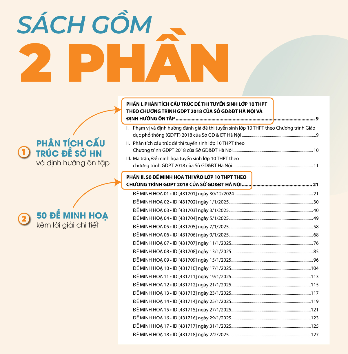 Sách 50 đề minh hoạ ôn thi vào 10 môn toán học [ Sở GD & ĐT Hà Nội ] - Moonbook Cuốn sách “50 ĐỀ MINH HOẠ THI VÀO 10 MÔN TOÁN” được biên soạn trên tinh thần quán triệt các yêu cầu cần đạt trong Chương trình Giáo dục phổ thông 2018 – Môn Toán cấp Trung học cơ sở, những đổi mới phương pháp dạy học, đổi mới cách kiểm tra đánh giá. Từ đó, học sinh thuận lợi hơn trong việc ôn luyện theo tinh thần đổi mới của Chương trình Giáo dục phổ thông 2018, giúp học sinh nhìn nhận lại những vấn đề toán học cốt lõi ở cấp trung học cơ sở và đánh giá năng lực toán học của học sinh. Trên tinh thần đó, nội dung cuốn sách “50 ĐỀ MINH HOẠ THI VÀO 10 MÔN TOÁN” được trình bày như sau: Phần I. Phân tích cấu trúc đề thi tuyển sinh lớp 10 THPT theo Chương trình GDPT 2018 của Sở GD&ĐT Hà Nội. I. Phạm vi và định hướng đánh giá đề thi tuyển sinh lớp 10 THPT theo Chương trình GDPT 2018 của Sở GD&ĐT Hà Nội. II. Phân tích cấu trúc đề thi tuyển sinh lớp 10 THPT theo Chương trình GDPT 2018 của Sở GD&ĐT Hà Nội. III. Đề minh họa tuyển sinh lớp 10 THPT theo chương trình GDPT 2018 của Sở GD&ĐT Hà Nội. Phần II. 50 Đề minh hoạ thi vào 10 môn toán (theo cấu trúc đề thi của Sở GD & ĐT Hà Nội).   Đối tượng chính của cuốn sách là học sinh lớp 9. Ngoài ra, đây cũng sẽ là tài liệu tham khảo bổ ích cho giáo viên trung học cơ sở, phụ huynh học sinh, sinh viên ngành Toán và những ai quan tâm đến việc dạy học phát triển tư duy Toán học, kiểm tra đánh giá bộ môn Toán khi tuyển sinh vào lớp 10 THPT theo chương trình GDPT 2018 của Sở GD&ĐT Hà Nội. Vì vây, tác giả đã biên soạn đáp án chi tiết cho 10 đề minh họa trong phần II để học sinh tích cực chủ động tự học trong quá trình ôn luyện mà vẫn đảm bảo các kiến thức, cách trình bày đúng khi giải bài tập. Qua đó là tiền đề để học sinh tích cực suy nghĩ, chịu mò mẫm, tìm lời giải cho các đề minh họa sau và giúp học sinh tự tin khi giải Toán   2. 50 đề minh hoạ ôn thi vào 10 môn toán học [ Sở GD & ĐT Hà Nội ] - Moonbook