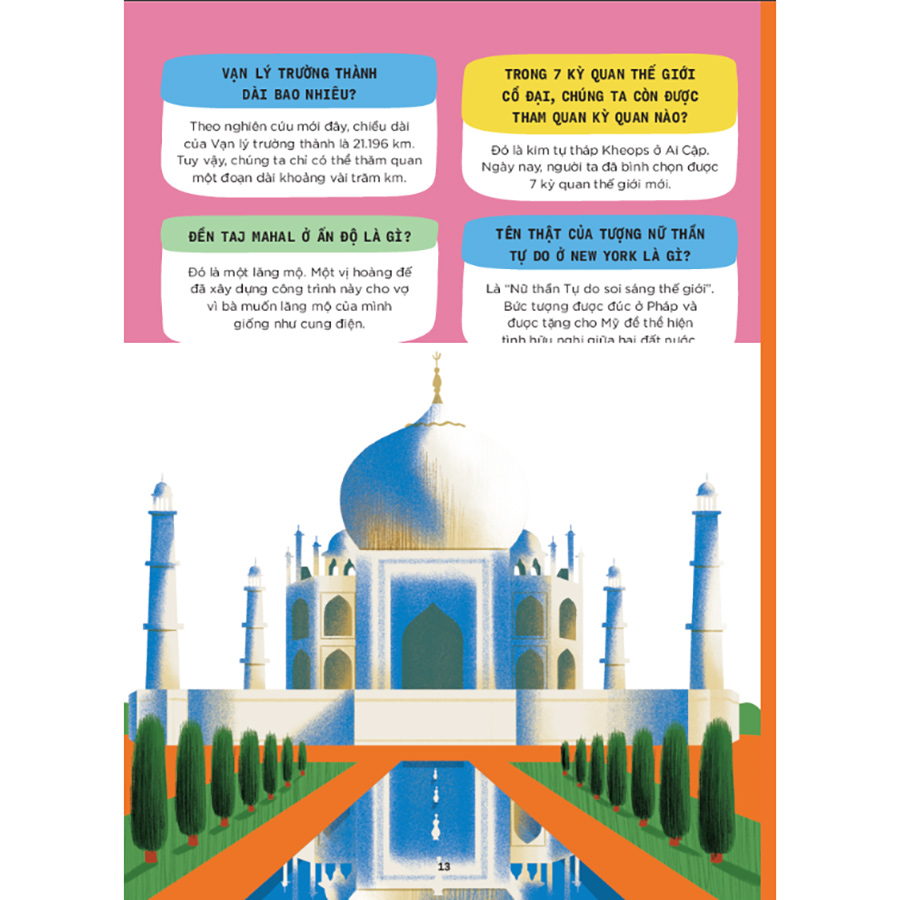 Có rất nhiều kì quan thế giới hiện đại, cũng như nhiều danh sách chính thức về các kì quan mới của thế giới được tạo ra từ năm 2000 đến 2007. Năm 2007, một tổ chức Thụy Sĩ mang tên New 7 Wonders (Bảy kì quan mới) đã lập nên một danh sách mới dựa trên số lượt bình chọn online. Hơn 600 triệu lượt bình chọn đã chọn ra được 7 kì quan chiến thắng: Vạn Lý Trường Thành của Trung Quốc; Petra của Jordan; Đấu trường La Mã, Đền Taj Mahal của Ấn Độ; Chichen Itza của Trung Mỹ; Machu Picchu và Tượng Chúa Cứu Thế. Cuốn sách cho chúng ta thấy các kì quan thế giới được xây dựng như thế nào? Thực tế các công trình đó hiện nay vẫn tồn tại, mặc dù nhiều trong số đó không còn nguyên vẹn. Tác giả đã cố gắng khắc họa lại hình ảnh ban đầu của những kì quan khi chúng mới được xây dựng, và tập trung mô tả kĩ thuật xây dựng với những chi tiết đặc trưng của từng kì quan. Các kì quan mới của thế giới cho chúng ta thấy sự phát triển trong kiến trúc, không chỉ từ góc độ lịch sử mà còn từ góc độ toàn cầu. Chúng cho phép chúng ta hiểu rõ hơn về cuộc sống của những người xây dựng các kì quan mới, cũng như biết thêm về những nhân vật mà kì quan thế giới mới được xây dựng cho. Đây là những công trình kiến trúc độc đáo, giúp chúng ta có cơ hội tiếp cận với các nền văn hóa trên thế giới và trong các giai đoạn lịch sử khác nhau. Cuốn sách này giúp độc giả như được du lịch khắp thế giới qua từng trang sách và vén bức màn bí mật về cách tạo ra các di tích kiến trúc góp phần định hình thế giới hiện đại. Những kì quan thế giới cổ đại được xây dựng như thế nào? Kì quan thế giới cổ đại là những viên ngọc quý được nhân loại muôn đời ngợi ca. Đó là những kiệt tác bất hủ minh chứng nỗ lực của con người trong việc đương đầu với thiên nhiên từ ngàn đời xưa. Qua cuốn sách này, chúng ta như được tận mắt chứng kiến những kì quan thế giới: Quần thể Kim tự tháp Giza; Vườn treo Babylon; Tượng thần Zeus ở Olympia; Đền Artemis ở Ephesus; Lăng mộ Halicarnassus; Tượng thần Mặt trời ở Rhodes; Hải đăng Alexandria. Qua cuốn sách này, bạn có thể quay ngược thời gian và tìm hiểu những bí mật về cách những viên ngọc kiến trúc cổ đại này được tạo ra. Tác giả đã cho thấy rằng, trước khi xuất hiện một kiệt tác vĩ đại luôn có một thứ nhỏ bé đầu tiên: Một ý tưởng, một kế hoạch, một bản vẽ, xây dựng, dựng nên một phần, hoàn thiện công trình, từ nhỏ trở nên lớn hơn, rồi thành lớn nhất. Trước khi xây dựng một kim tự tháp, một bức tượng khổng lồ, một vườn treo vĩ đại, con người cần đến hàng triệu bước thực hiện nhỏ bé, những công việc căng thẳng, những việc làm hằng ngày, mồ hôi, máu và cả nước mắt để hiện thực hóa tầm nhìn của các kiến trúc sư khi vẽ nên những dáng hình, góc cạnh và màu sắc.