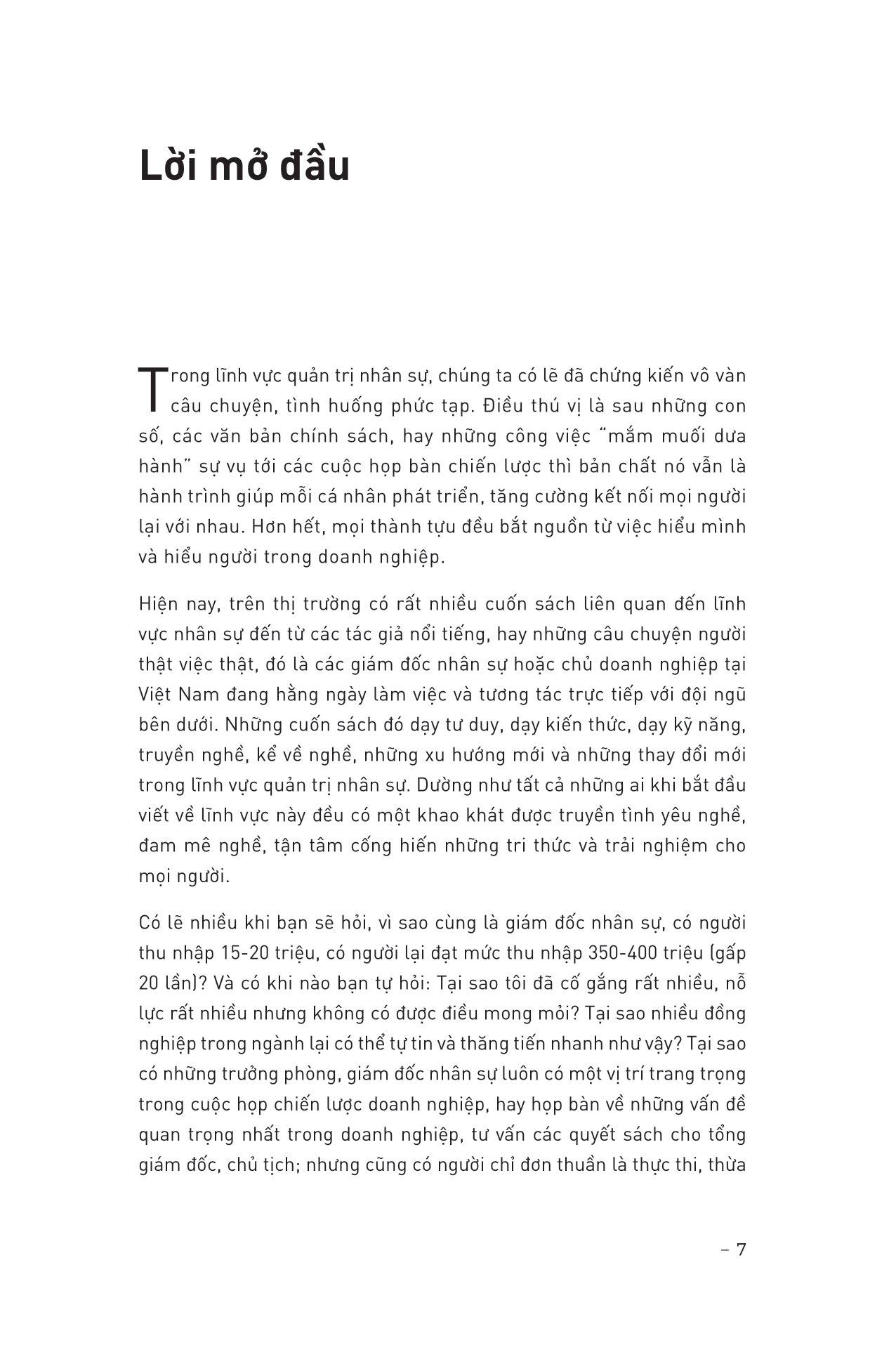 Cuốn sách được viết với sự say mê, nhiệt tình, nhằm mong muốn có thể truyền đi tinh thần làm nghề, giúp độc giả có những hình dung về lộ trình phát triển của nghề nhân sự, và từng bước “chạm” đến hành trình phát triển của cá nhân.