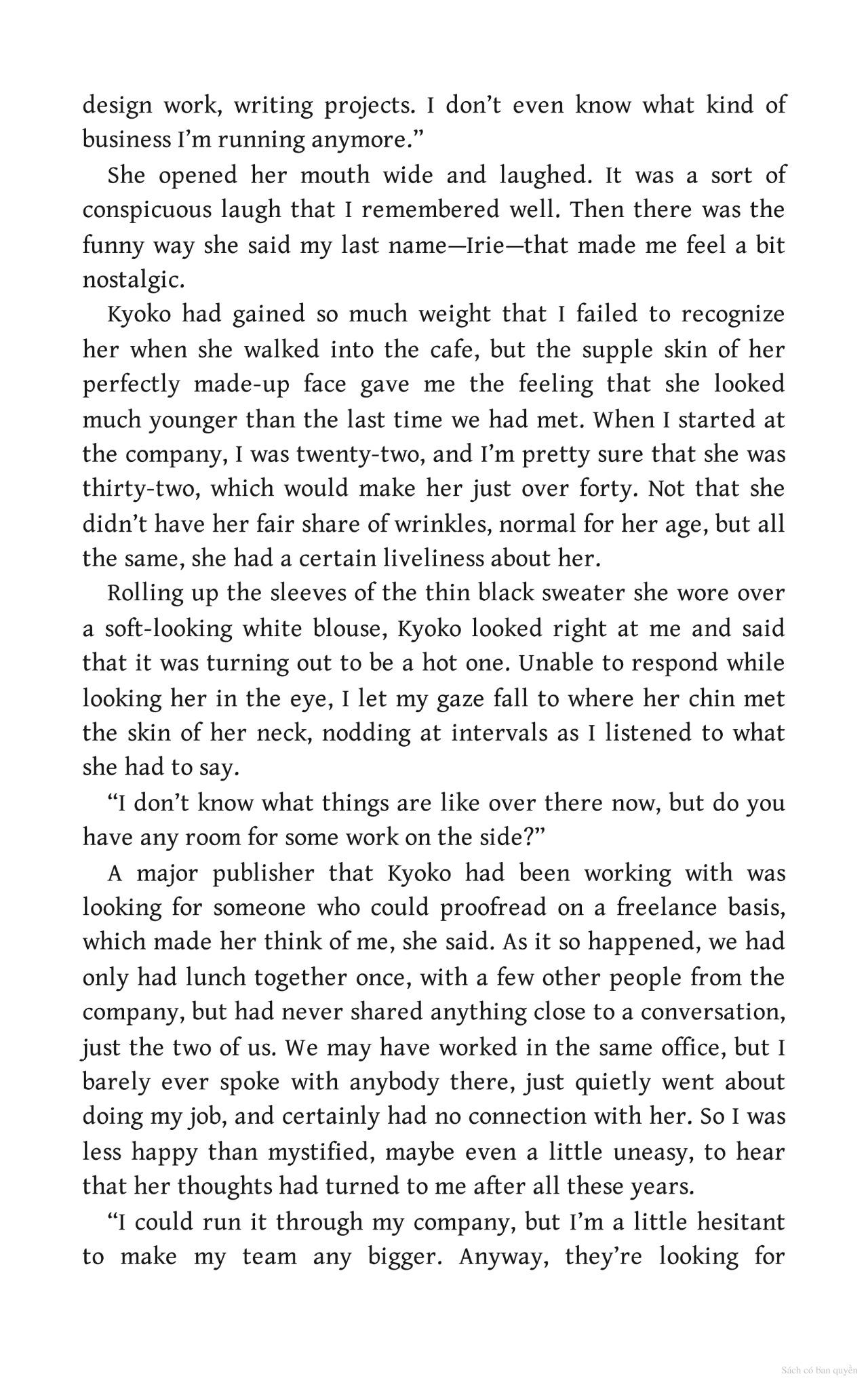 Fuyuko Irie is a freelance proofreader in her thirties. Living alone in an overwhelming city and unable to form meaningful relationships, she has little contact with anyone other than her colleague, Hijiri. But a chance encounter with a man named Mitsutsuka awakens something new in her. Through their weekly meetings, Fuyuko starts to see the world in a different light and still, painful memories from her past begin to resurface.