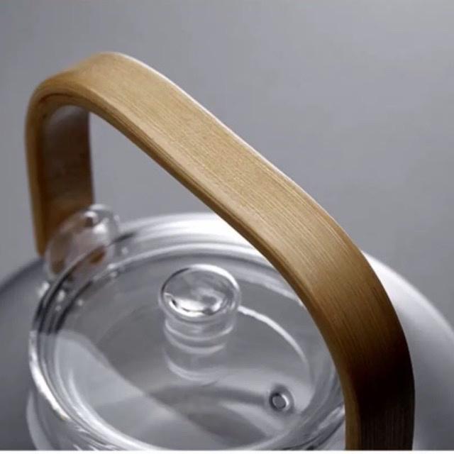 Bộ ly ấm pha trà thủy tinh chịu nhiệt quai gỗ có thể nấu trên bếp hồng ngoại, bếp gas