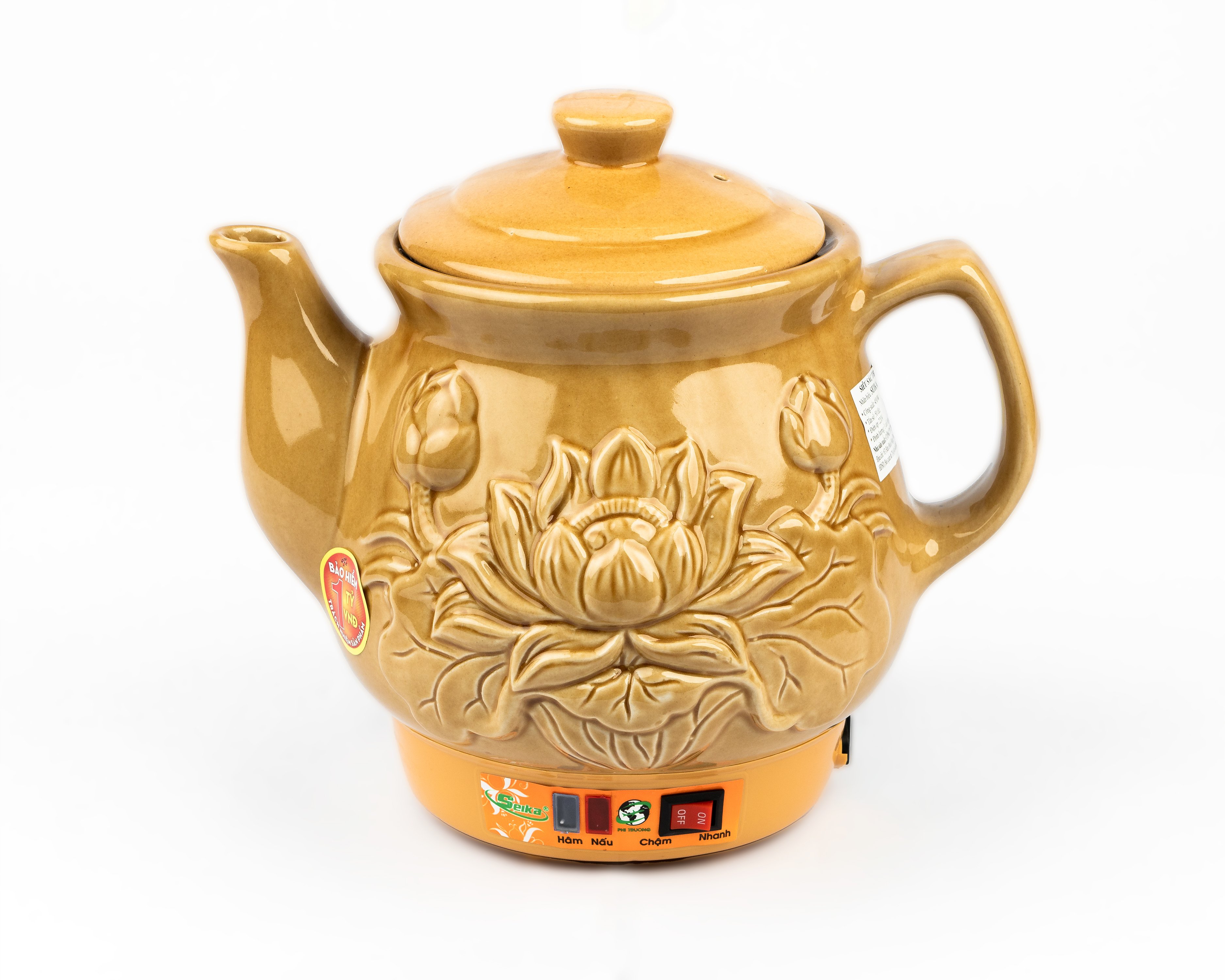 Dung tích: 2.8 L- Công suất: 450W- Thân ấm thiết kế với hoa văn ông già - củ sâm- Nguồn gốc sứ từ làng gốm Bát Tràng nổi tiếng- Chất liệu gốm được nung ở