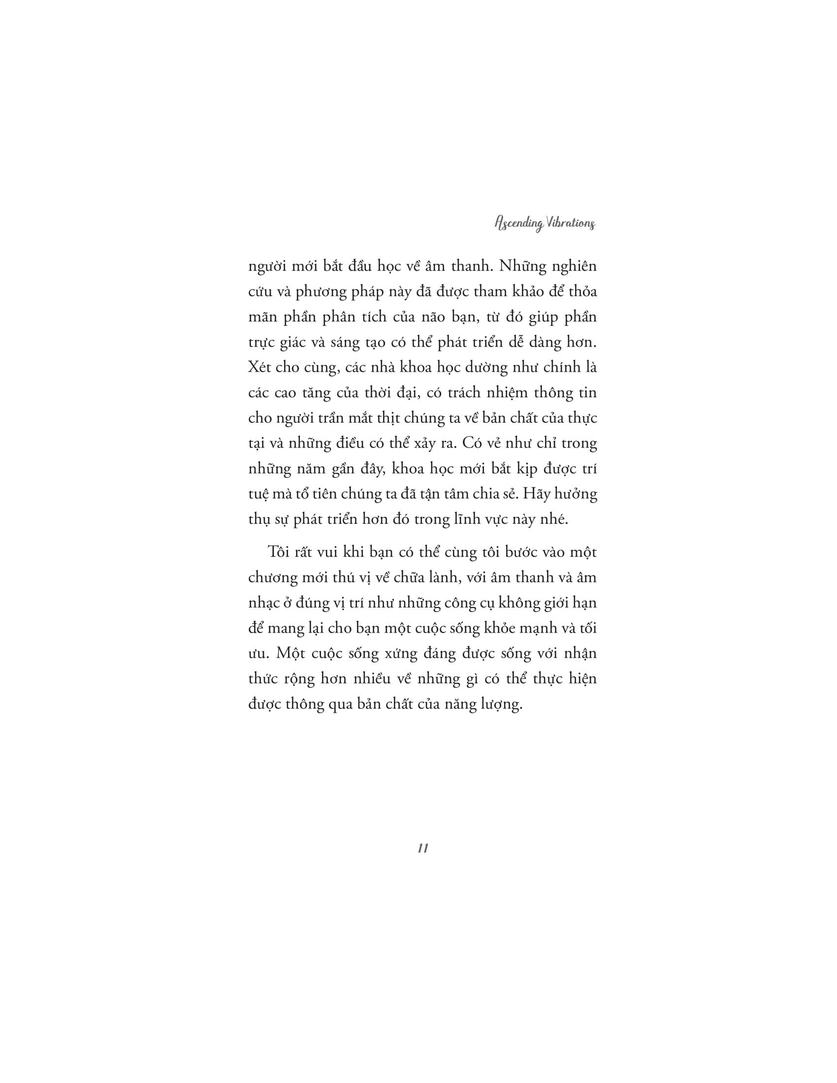 Một trong những thông điệp quan trọng của cuốn sách là sự kết nối sâu sắc giữa con người và vũ trụ thông qua âm thanh. Các rung động âm thanh không chỉ giúp giải phóng những cảm xúc bị kìm nén, mà còn mở ra những con đường năng lượng, giúp con người tiếp cận những tần số cao hơn, mang lại sự bình an và nhận thức sâu sắc về sự hiện diện và vai trò của m.ình trong vũ trụ.