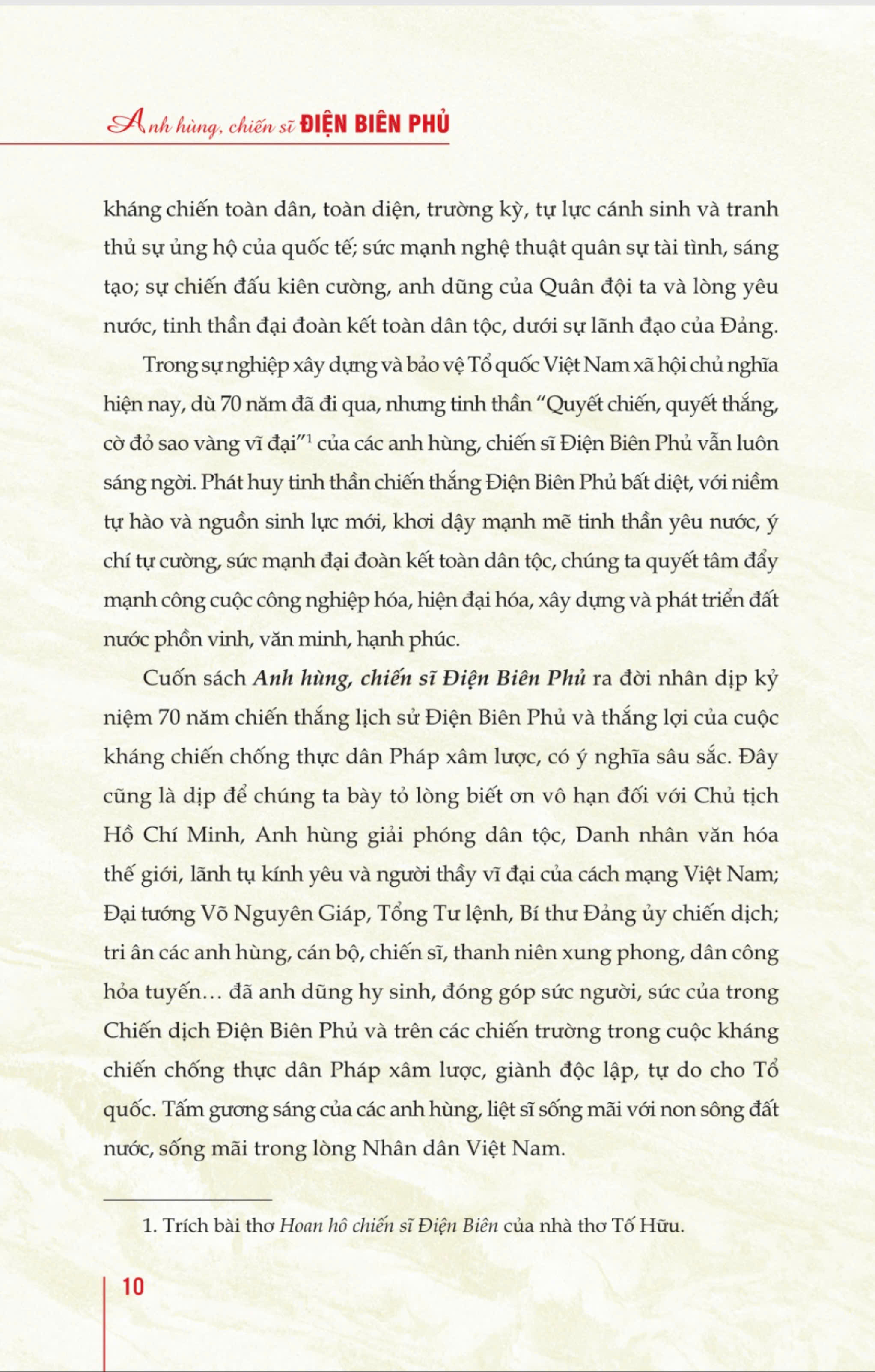 Kỷ niệm 70 năm chiến thắng lịch sử Điện Biên Phủ (07/5/1954 - 07/5/2024), Nhà xuất bản Chính trị quốc gia Sự thật phối hợp với Tỉnh ủy Điện Biên tổ chức biên soạn, xuất bản cuốn sách Anh hùng, chiến sĩ Điện Biên Phủ. Cuốn sách là ấn phẩm có ý nghĩa đặc biệt quan trọng, thể hiện tình cảm và sự tri ân sâu sắc của các thế hệ người dân Việt Nam đối với công lao của các anh hùng, liệt sĩ đã anh dũng hy sinh xương máu và tuổi thanh xuân cho chiến thắng vĩ đại này.