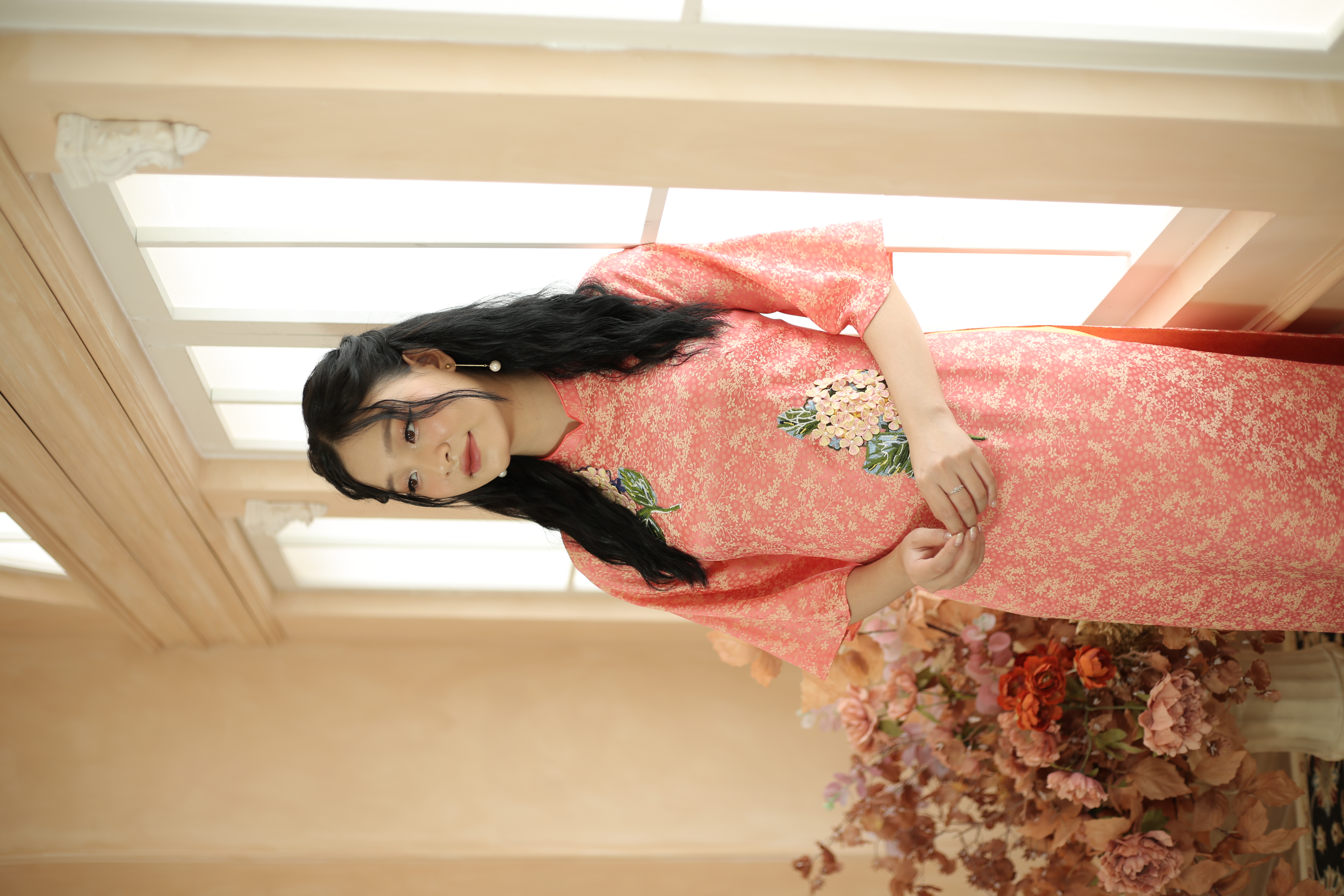 Mua tại TiktokÁo dài thiết kế form suông may bằng chất liệu lụa gấm loại 1 màu cam nhẹ nhàng, kết hoa thủ công, tay lỡ loe, quần lụa vàng