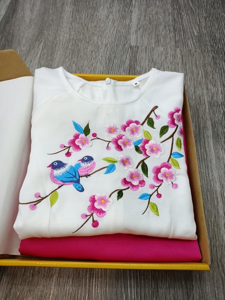 - 1 áo dài trắng thêu lắc tay hoạ tiết hoa lá tinh tế , sắc sảo
