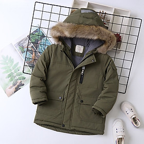 Áo khoác bé trai lót lông, Áo Parka cho bé 5-14 tuổi mũ lông túi hộp có mũ vành lông và khóa kéo tiện lợi