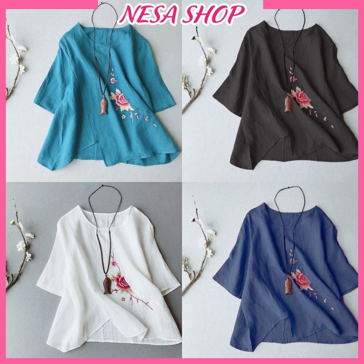 ✨Áo kiểu nữ cổ tròn tay lỡ form rộng thoải mái, chất liệu Đũi cao cấp mềm mịn, mát, hoạ tiết Thêu tỉ mỉ NeSa Shop AKH.57