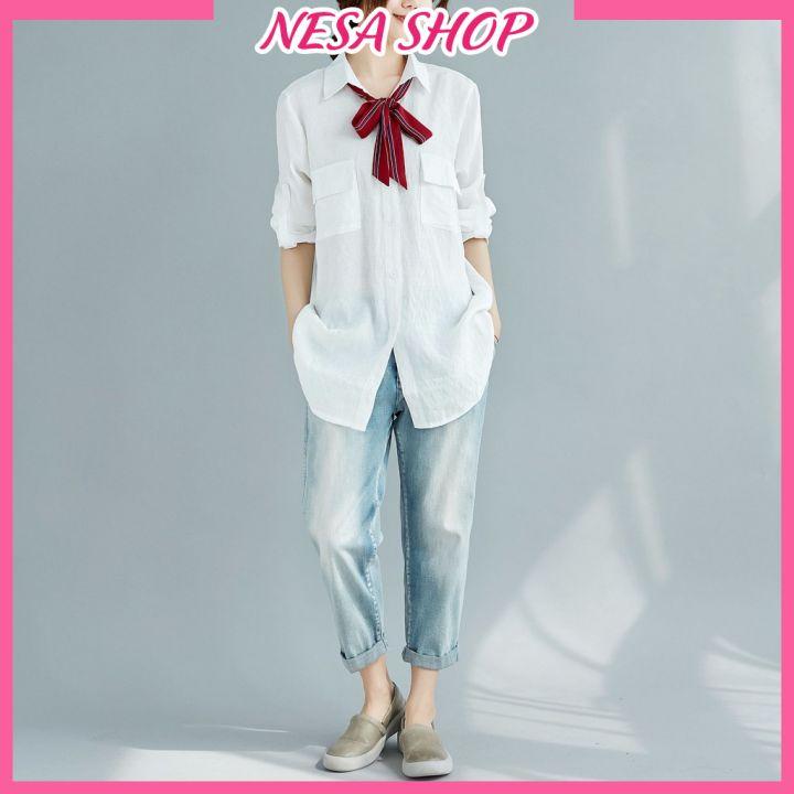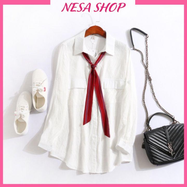 1.Tên sản phẩm: Áo sơ mi nữ trắng dài tay, áo form rộng, chất liệu Đũi tơ mềm mịn, sơ mi nữ đẹp phong cách Hàn Quốc NeSa Shop.