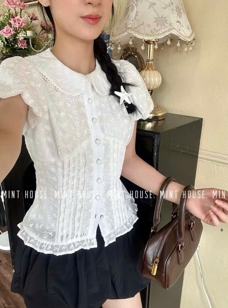 CHI TIẾT SẢN PHẨM - Sản phẩm : Áo sơ mi kiểu tay phồng dễ thương nữ tính thích hợp công sở Garnet Miều Est.2013 - Chất liệu : Xô Ren - Màu sắc :