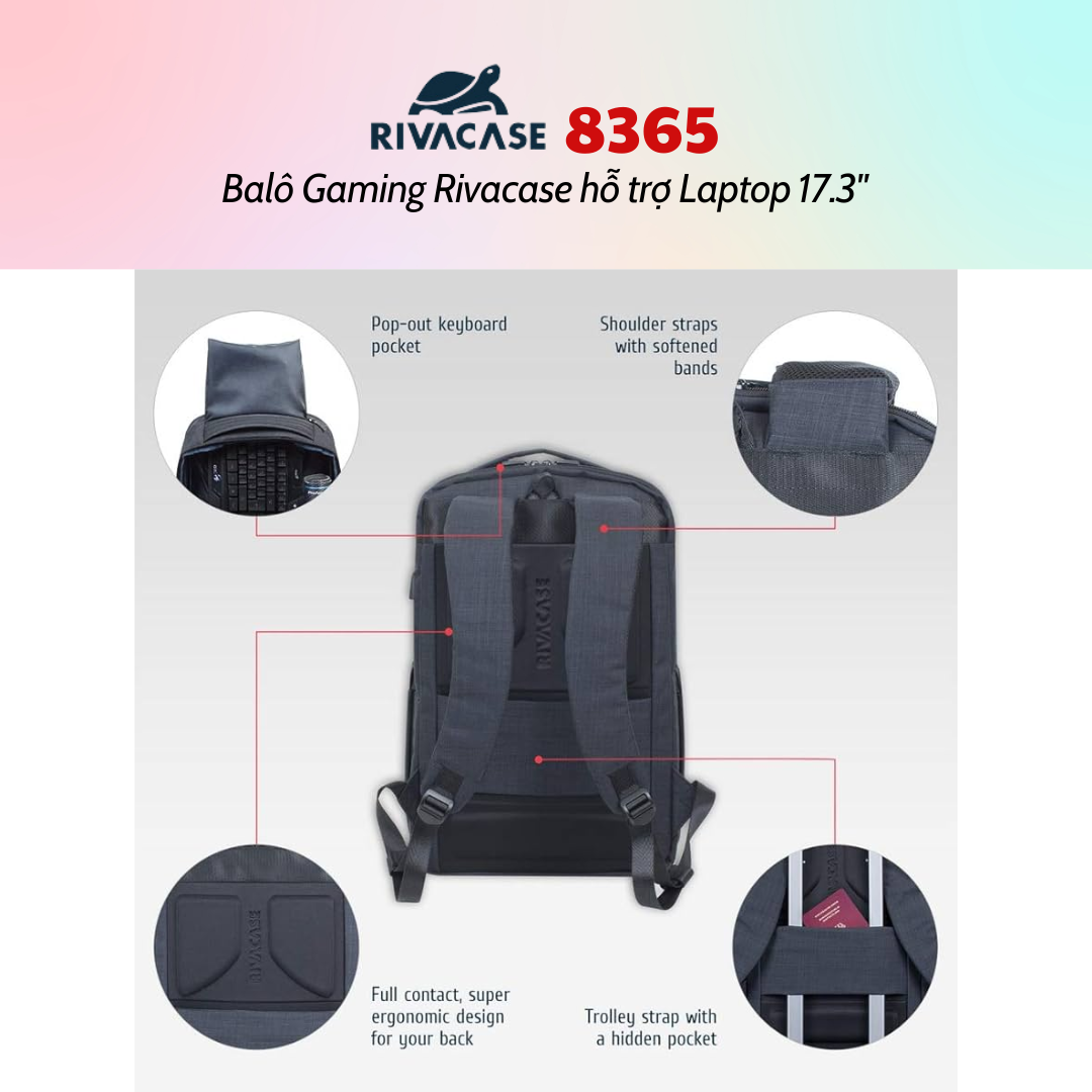 • Ba lô Rivacase 8365 là sản phẩm thiết kế không chỉ thích hợp cho các game thủ mà còn thích hợp sử dụng cho các chuyến công tác và du lịch