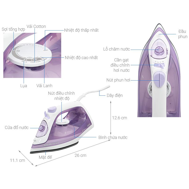 Ngăn chứa nước lớn 300ml giảm thiểu số lần châm nước do đó bạn có thể ủi nhiều quần áo hơn trong một lần châm. Công suất 2600 W giúp làm nóng nhanh: Cung cấp