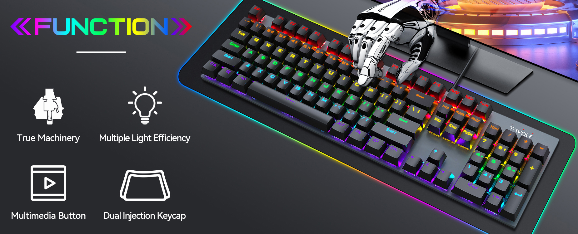 Thiết kế full-size 104 phím hiện đại T-Wolf T17 sở hữu thiết kế hiện đại, trẻ trung với tông màu đen chủ đạo, cùng hệ thống đèn LED RGB rực rỡ, tạo điểm nhấn cho