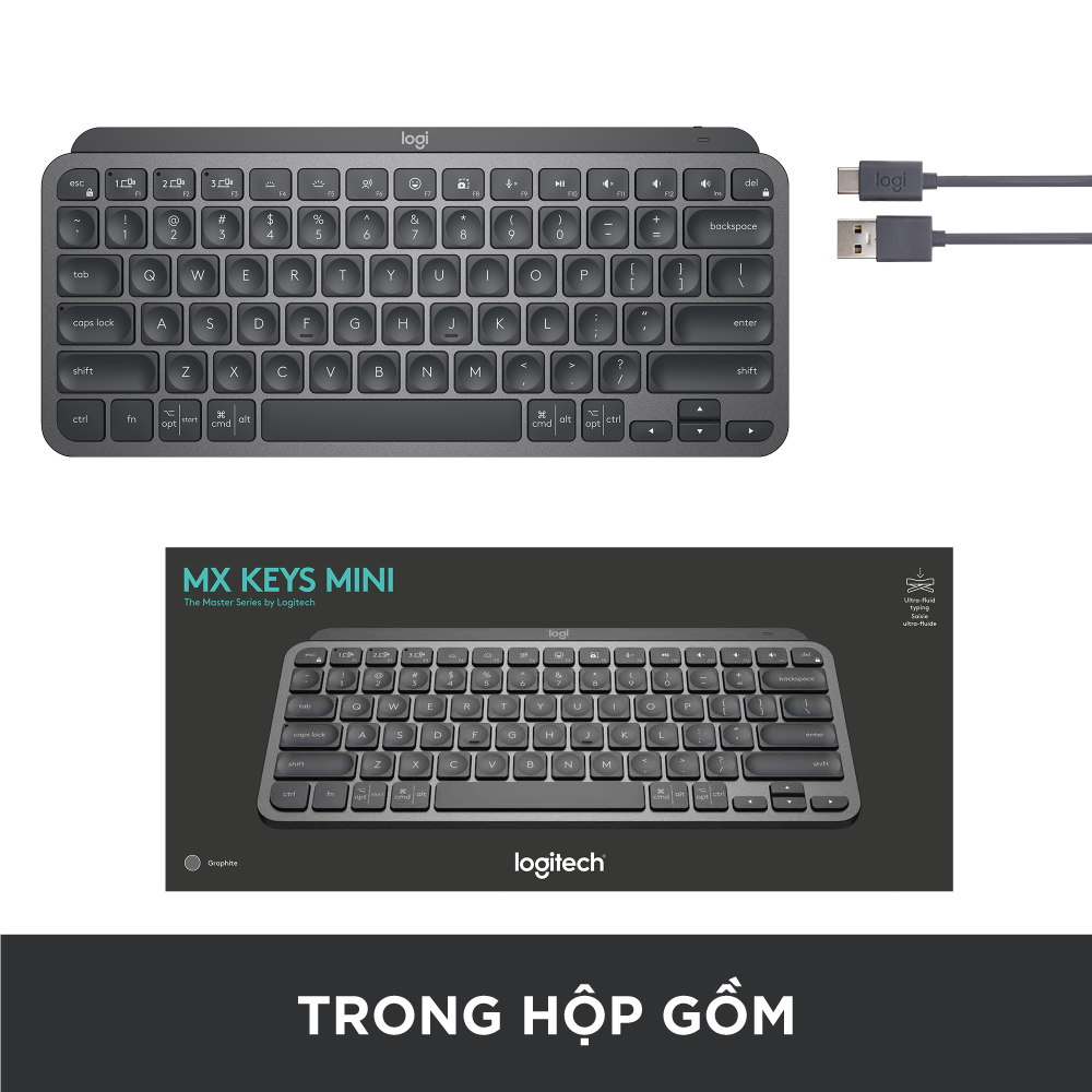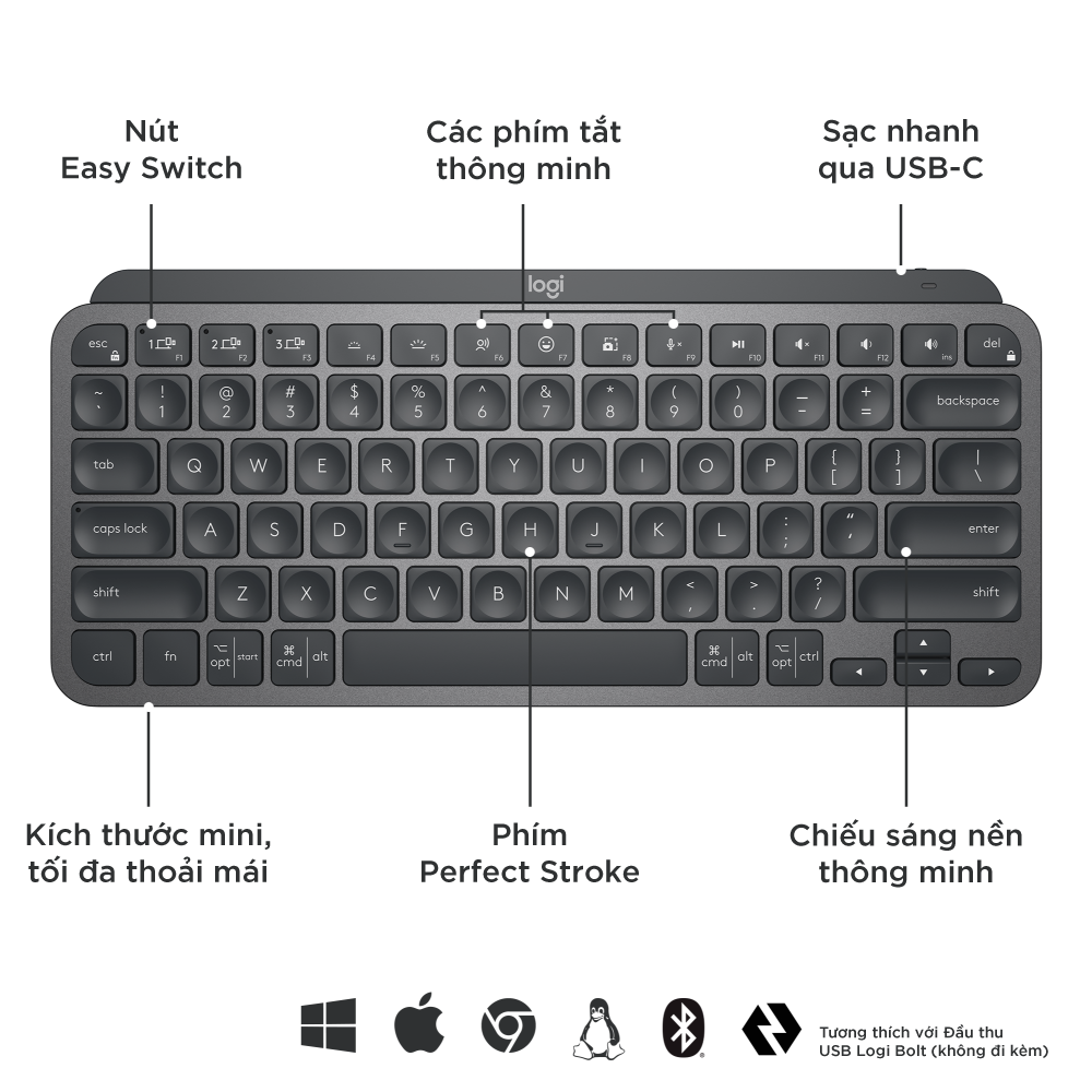 Bàn phím không dây Bluetooth Logitech MX Keys Mini - Nhỏ gọn, Sạc USB-C, Phím tắt thông minh, Có bản cho Mac • CÁC PHÍM THÔNG MINH PERFECT STROKE Gõ trên các phím được
