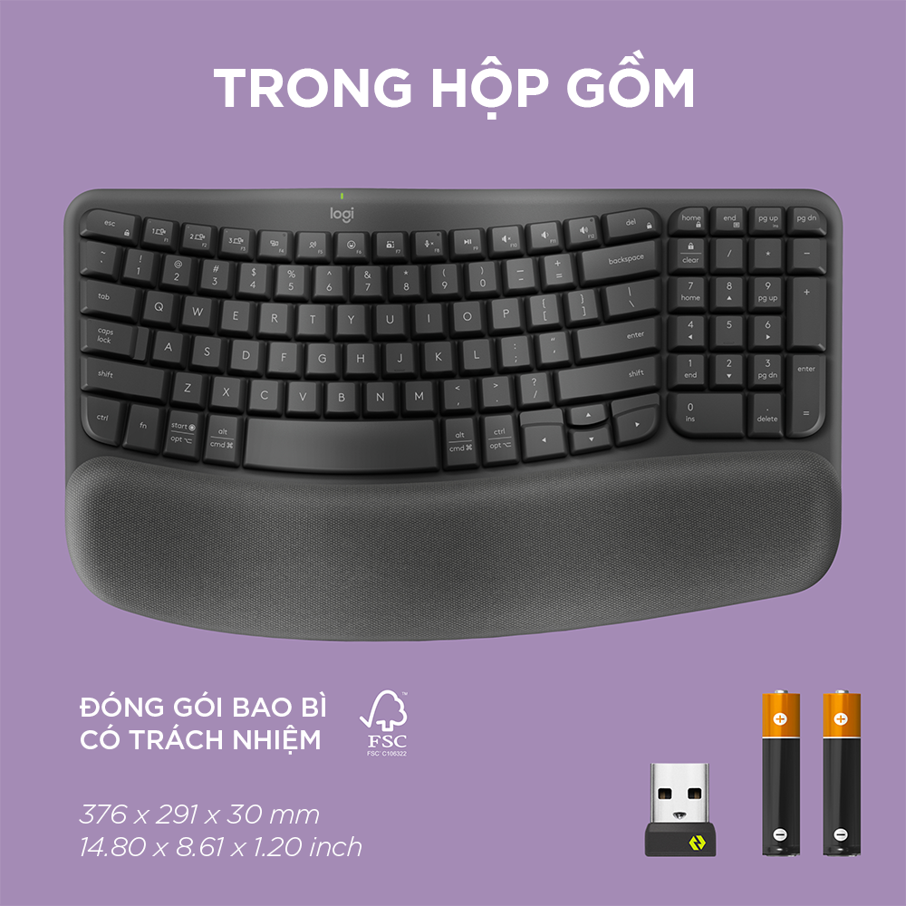 Thiết kế lượn sóng của bàn phím nhỏ gọn này đặt bàn tay, cổ tay và cánh tay bạn ở vị trí gõ tự nhiên.