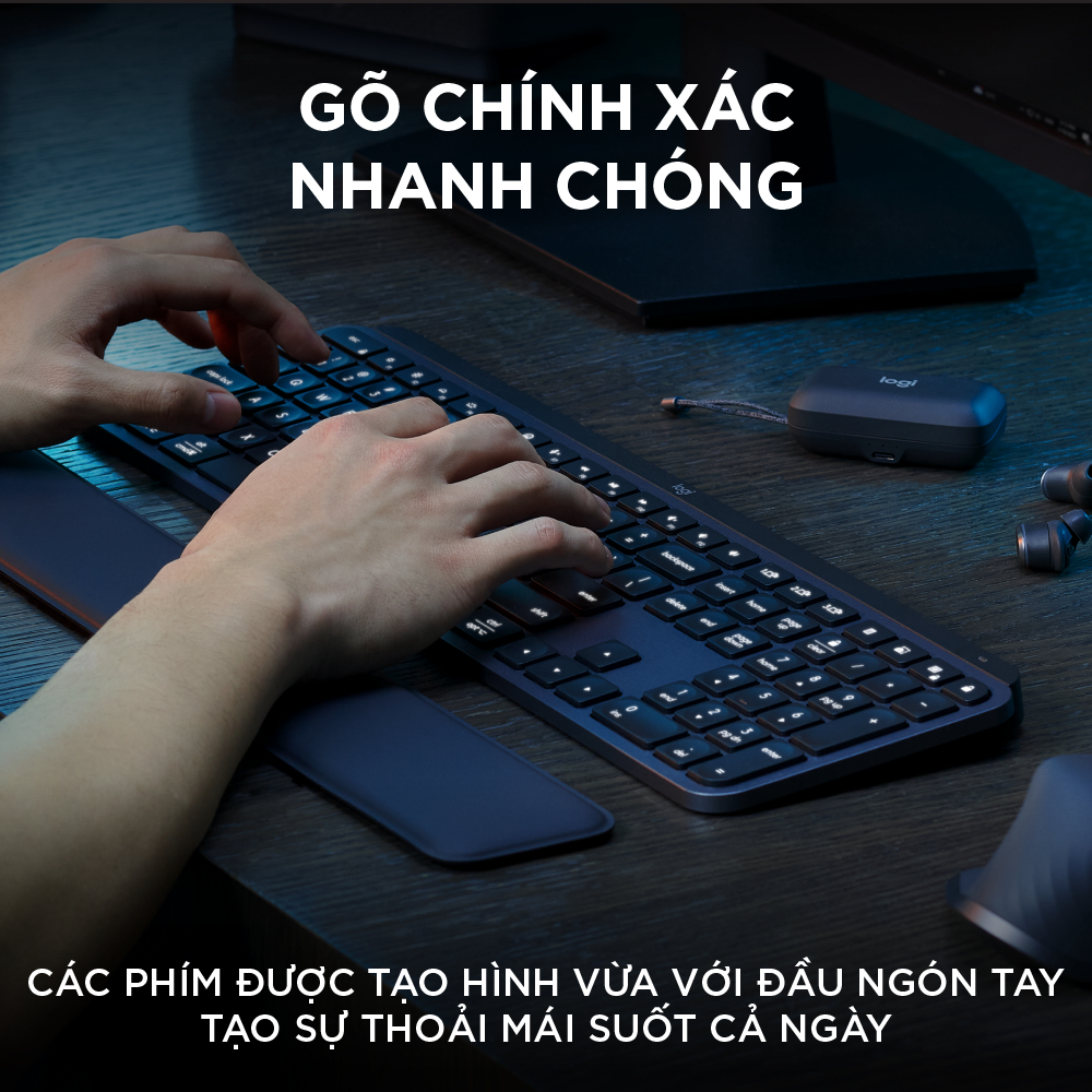 Bàn Phím Logitech MX Keys Wireless/ Bluetooth Thiết kế phím hiện đại Thiết kế mới với các phím hình cầu phù hợp với đầu ngón tay, giúp giảm tiếng ồn, đồng thời tối ưu hoá