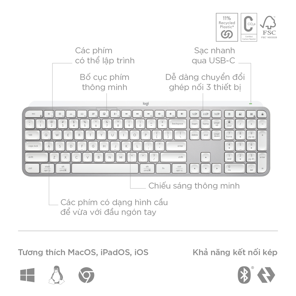 Mô Tả Sản Phẩm Dòng sản phẩm bàn phím không dây Logitech MX Keys rất được dân văn phòng mà đặc biệt là người dùng MacOS ưa thích bởi kiểu dáng thanh lịch, sang trọng. Những ai