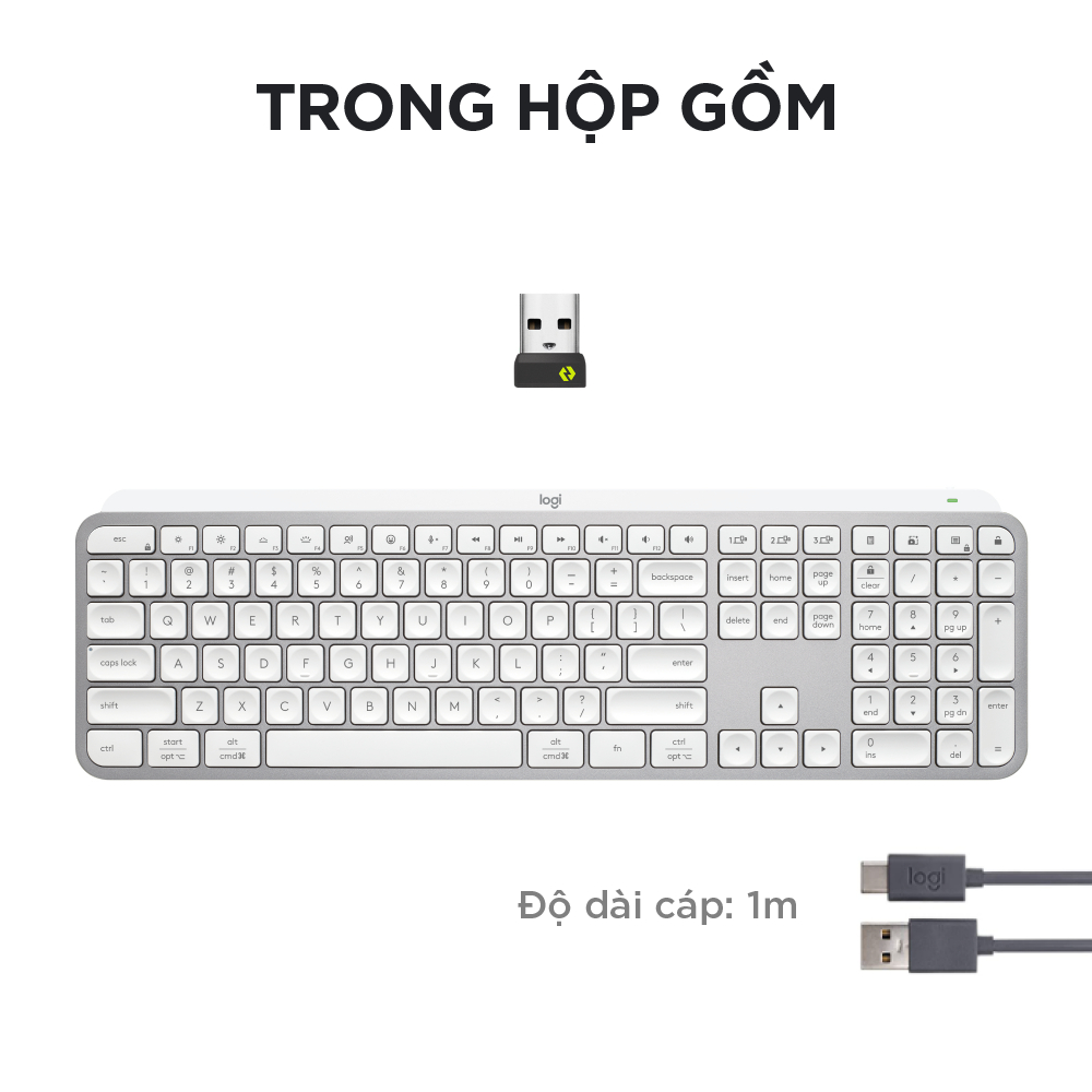 Thông số & Chi tiết Kích thước Bàn phím MX Keys S Chiều cao: 131,63 mm Chiều rộng: 430,2 mm Chiều dày: 20,5 mm Trọng lượng: 810 g Đầu thu USB Logi Bolt Chiều cao: