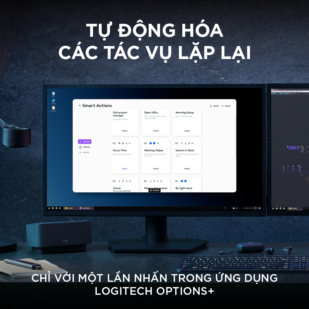Smart Actions trên ứng dụng Logi Options+14Yêu cầu ứng dụng Logi Options+, có sẵn cho Windows và macOS cho phép bạn bỏ qua các hành động lặp lại bằng cách tự động hóa nhiều tác vụ chỉ với một lần nhấn phím.