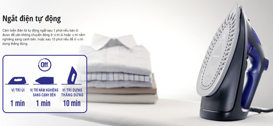 Bàn ủi Panasonic có chức năng chống nhỏ giọt và chế độ chống cặn, giúp ngăn không cho nước rò rỉ ra ngoài, không làm ố vàng quần áo, bằng cách khi nhiệt độ của bàn ủi giảm xuống đến một mức nhất định, bàn là sẽ tự động cấp nước để ngăn chặn rò rỉ từ các lỗ thông hơi. Và khả năng ngắt điện tự động sau 1 phút nếu bàn ủi để yên không chuyển động ở vị trí ủi hoặc vị trí nằm nghiêng sang cạnh bên, hoặc sau 10 phút ở vị trí dựng đứng.