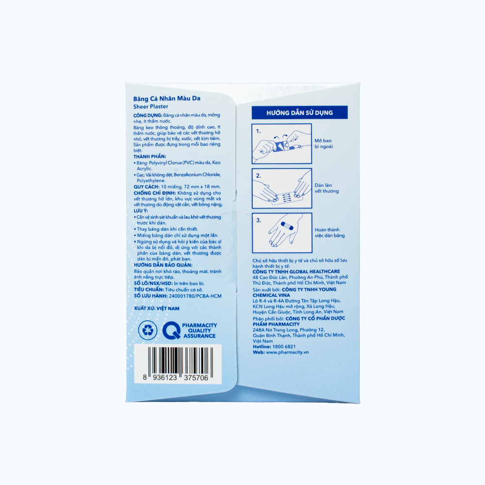 Ưu điểm của sản phẩm Băng dán cá nhân khoáng khí, giúp bảo vệ vết thương hiệu quả. Có độ dính cao. Bảo vệ các vết thương nhỏ. Trong suốt hoàn toàn. Băng trùng với màu da   Thành phần Băng: Polyvinyl Chloride, màu da Gạc: vải không dệt màu da Được đựng trong mỗi bao, mỗi cái riêng biệt. Công dụng Băng dán cá nhân Pharmacity giúp bảo vệ vết thương ngoài da. Với khả năng chống thấm nước và có độ dính cao, băng cá nhân Pharmacity giúp bảo vệ các vết trầy xước, vết thương hiệu quả. Cách sử dụng Bước 1: Mở bao bì ngoài Bước 2: Dán lên vết thương Bước 3: Hoàn thành việc dán băng Lưu ý Làm vệ sinh da và lau khô trước khi dán băng. Thay băng hằng ngày. Thông tin sản xuất Bảo quản: Nơi thoáng mát và khô ráo. Chỉ định: Băng keo thông thoáng, độ dính cao, ít thấm nước, giúp bảo vệ vết thương nhỏ, vết trầy, xước. Quy cách đóng gói: Gói 10 miếng (72 x 18 mm)