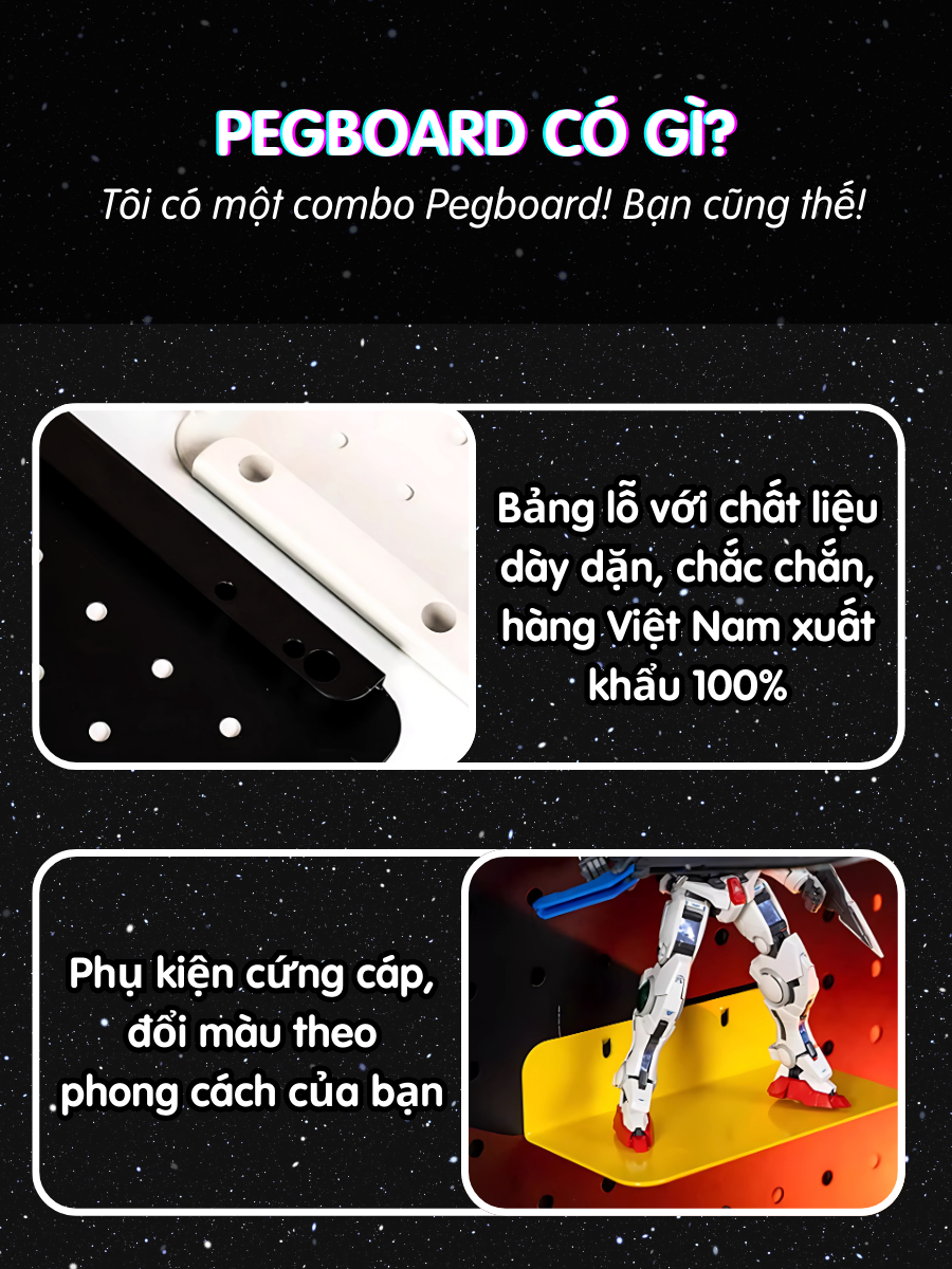 Bảng pegboard có chức năng 3 trong 1, vừa để được chân đứng, vừa kẹp bàn và có thể treo tường 1 cách dễ dàng và linh động.