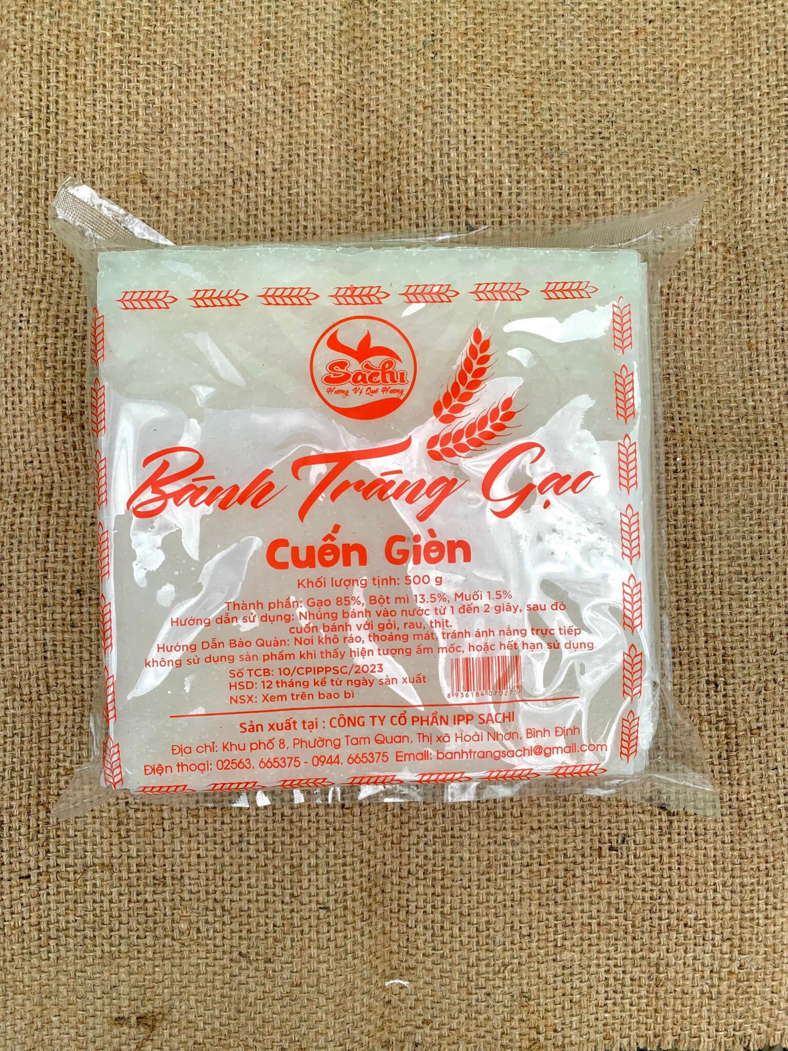 Bánh tráng gạo cuốn giòn Sachi được làm từ 100% gạo, 100% chất lượng, bánh được khách hàng cả xứ Bình Định và Sài Gòn đặc biệt ưa thích. Bánh tráng gạo cuốn giòn Sachi