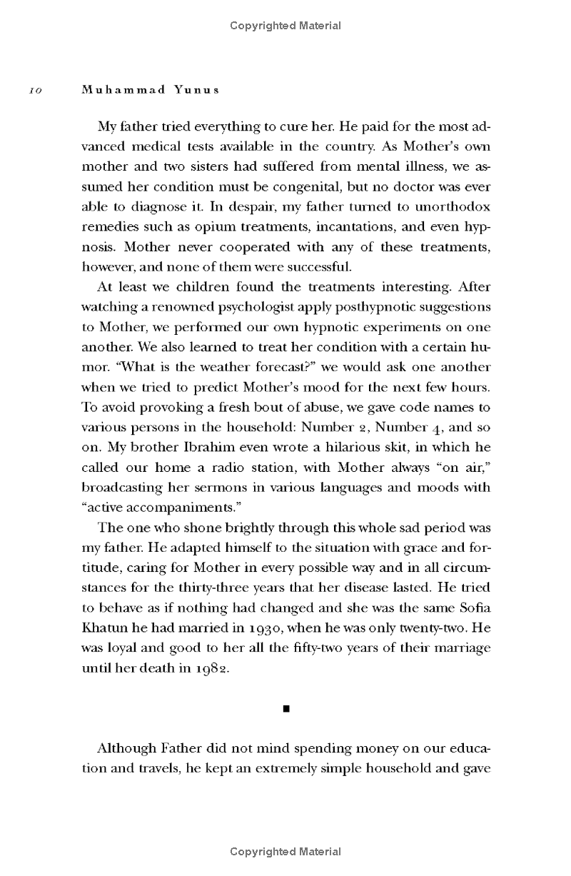 Muhammad Yunus is that rare thing: a bona fide visionary. His dream is the total eradication of poverty from the world. In 1983, against the advice of banking and government officials, Yunus established Grameen, a bank devoted to providing the poorest of Bangladesh with minuscule loans. Grameen Bank, based on the belief that credit is a basic human right, not the privilege of a fortunate few, now provides over 2.5 billion dollars of micro-loans to more than two million families in rural Bangladesh. Ninety-four percent of Yunus's clients are women, and repayment rates are near 100 percent. Around the world, micro-lending programs inspired by Grameen are blossoming, with more than three hundred programs established in the United States alone. Banker to the Poor is Muhammad Yunus's memoir of how he decided to change his life in order to help the world's poor. In it he traces the intellectual and spiritual journey that led him to fundamentally rethink the economic relationship between rich and poor, and the challenges he and his colleagues faced in founding Grameen. He also provides wise, hopeful guidance for anyone who would like to join him in "putting homelessness and destitution in a museum so that one day our children will visit it and ask how we could have allowed such a terrible thing to go on for so long." The definitive history of micro-credit direct from the man that conceived of it, Banker to the Poor is necessary and inspirational reading for anyone interested in economics, public policy, philanthropy, social history, and business. Muhammad Yunus was born in Bangladesh and earned his Ph.D. in economics in the United States at Vanderbilt University, where he was deeply influenced by the civil rights movement. He still lives in Bangladesh, and travels widely around the world on behalf of Grameen Bank and the concept of micro-credit.