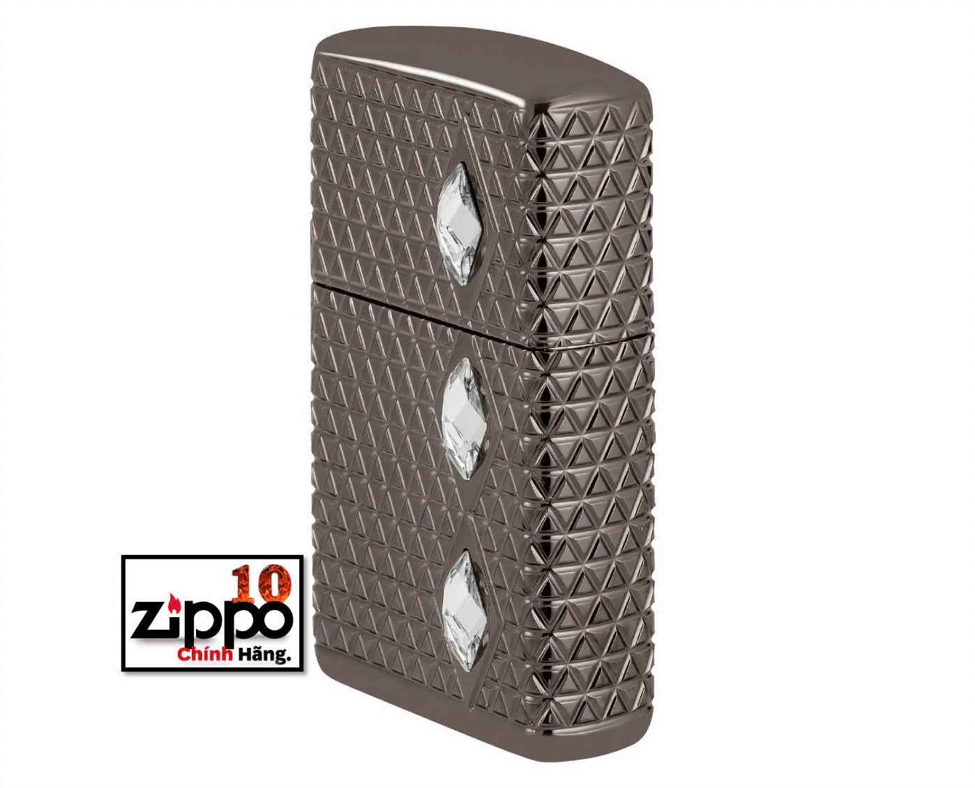 Được bao quanh bởi họa tiết kim cương MultiCut thanh lịch, ba viên pha lê lấp lánh lấp lánh trên bề mặt của chiếc bật lửa Armor Black Ice tinh xảo này. Được đóng gói trong một hộp quà tặng và kèm theo hướng dẫn sử dụng. Để có hiệu suất tối ưu, hãy đổ nhiên liệu bật lửa Zippo.