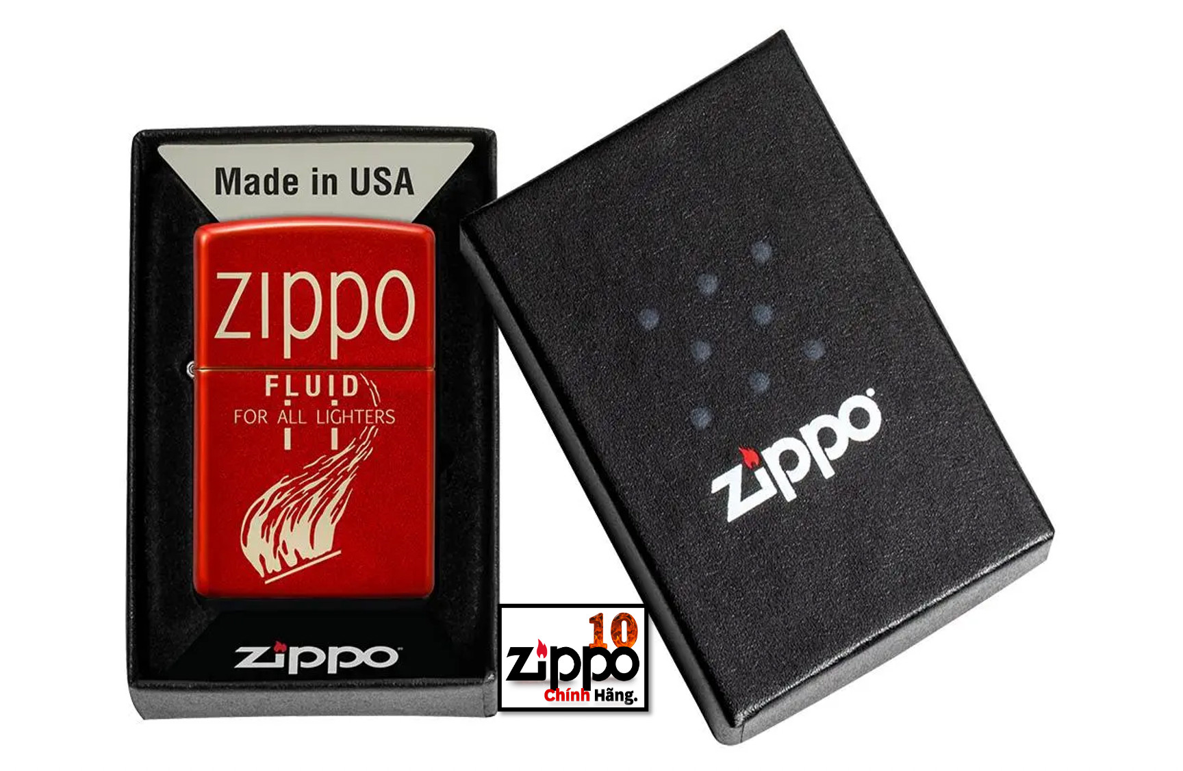 - Bật Lửa Zippo Logo Đỏ được đóng gói trong hộp có thể làm quà tặng.  - Sản phẩm chính hãng Zippo, chống gió tốt, bật nhẹ với âm thanh "click" đặc trưng của Zippo. -