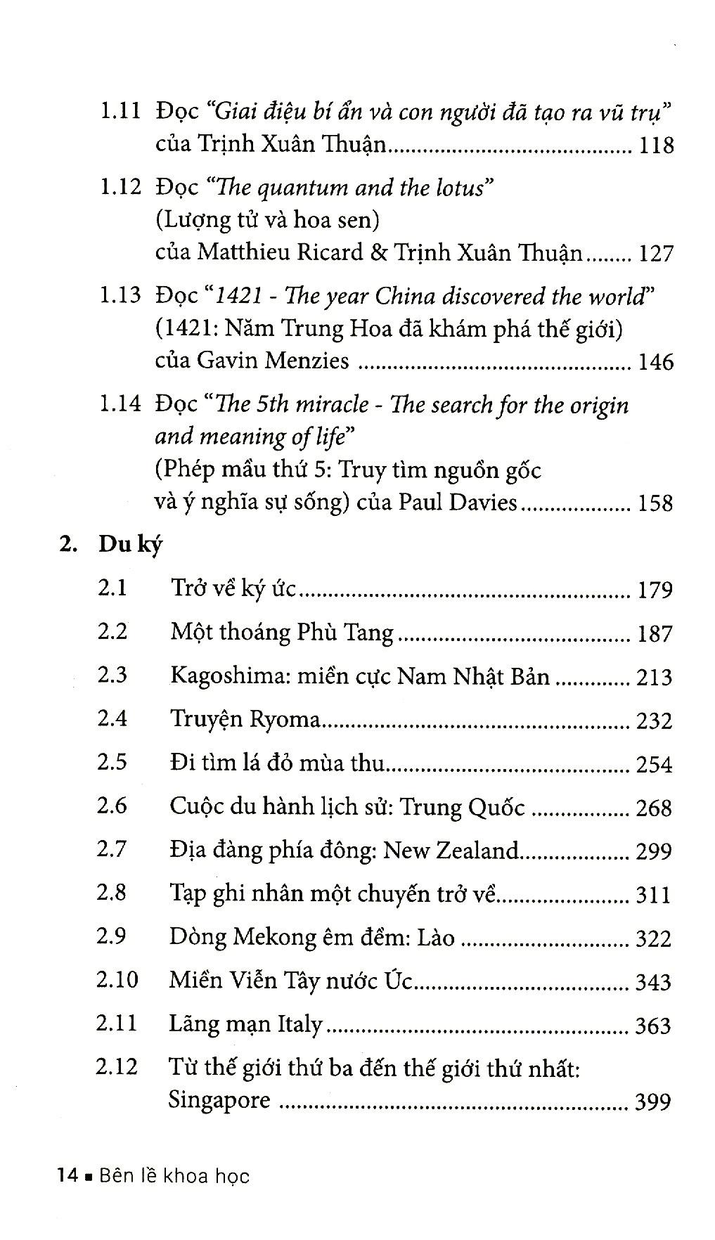 Cuốn sách gồm hai phần chính: Phần 1: Khoa học và Giáo dục, và Phần 2: Du ký.Phần I, “Khoa học và Giáo dục” có 14 tiểu đề, bàn về những vấn nạn trong nghiên cứu khoa học nói chung, như...