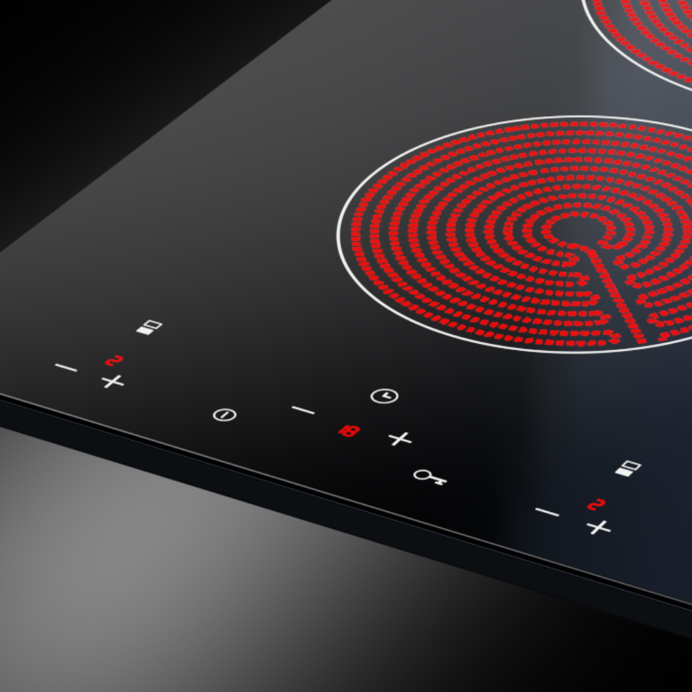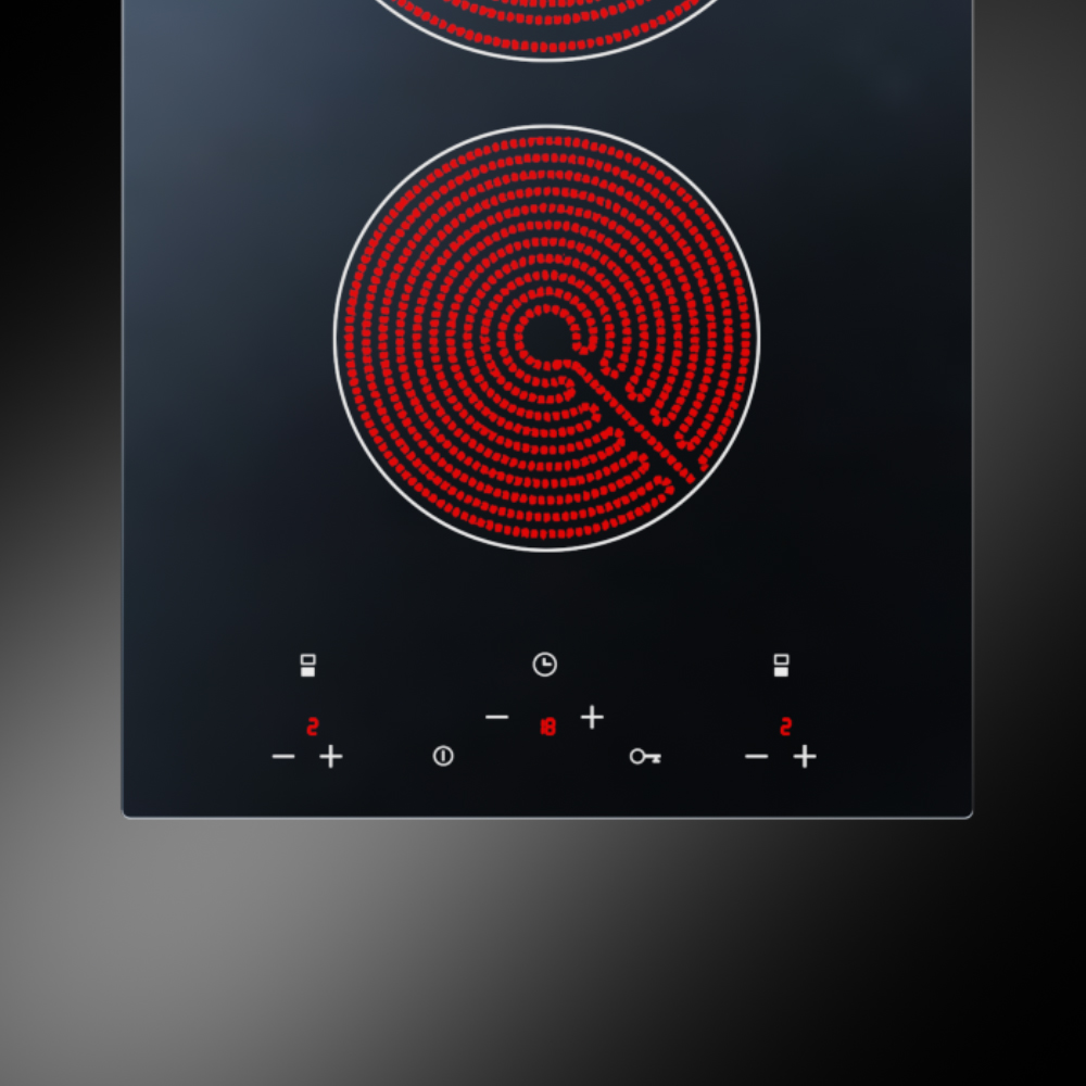 Bếp 02 điện Mặt kính crystal siêu bền, chịu lực chịu sốc nhiệt 9 dải công suất Điều khiển cảm ứng Slider độc lập dạng ẩn trực tiếp trên mặt bếp Chế độ hẹn giờ,