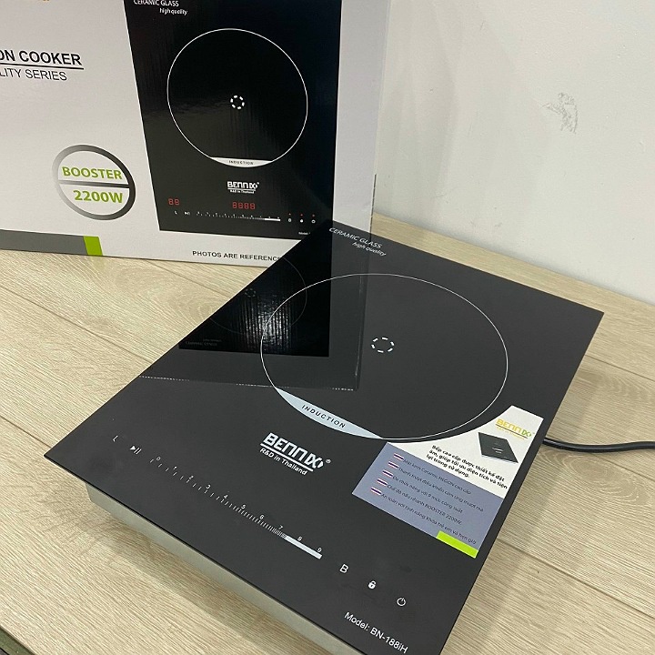 Mô tả sản phẩm Bếp Điện Từ Cao Cấp, Bếp Từ Âm Đơn Bennix Thiết Kế Tinh Xảo, Mặt Bếp Ceramic Bền Đẹp, Sáng Bóng, Dễ Vệ Sinh, Công Suất 2200W Đa Chức Năng Nấu, Điều Khiển Cảm Ứng Hiện Đại, Dễ Quan Sát Và Thao Tác Thương Hiệu: Bennix Chất liệu mặt bếp: Ceramic Nguồn điện áp: 220V/50Hz Bảng điều khiển: Cảm ứng Hẹn giờ: Có Khóa trẻ em: Có Công suất: 2.200W Màu sắc: Đen Sản xuất tại: Thái lan Xuất xứ thương hiệu: Thái Lan Kích thước mặt kính:300x390mm Kích thước lỗ chờ: 275x365mm Bảo Hành: 12 Tháng Bếp Từ Đơn Bennix Thiết Kế Tinh Xảo, Mặt Bếp Ceramic Bền Đẹp, Sáng Bóng, Dễ Vệ Sinh, Công Suất 2200W Đa Dang Chức Năng Nấu, Điều Khiển Cảm Ứng Hiện Đại, Dễ Quan Sát Và Thao TácƯu điểm nổi bật của bếp điện từ đơn Bennix Bennix là mẫu bếp từ đơn rất được ưa chuộng, đến từ thương hiệu của Thái Lan, áp dụng dây chuyền sản xuất hiện đại của Đức đảm bảo độ bền. Bếp từ sở hữu màu đen tuyền sạch sẽ, bề mặt bếp bằng kính ceramic có khả năng chịu nhiệt độ cao, chịu lực tốt, dễ lau chùi vệ sinh bằng khăn ẩm. Bếp từ Bennix trang bị công suất 2200W giúp nấu ăn nhanh chóng. Với chiếc bếp từ này bạn có thể nấu canh, đun nước, xào rau, chiên thực phẩm, hầm, kho cá đều rất tiện lợi. Khung bếp từ Bennix thiết kế chắc chắn, có 4 chân đế giúp kê bếp được cao hơn, tản nhiệt tốt hơn. Mặt dưới của bếp từ có trang bị thêm quạt tản nhiệt để làm mát cho động cơ, giúp bếp từ hoạt động được liên tục trong thời gian dài, tránh quá tải nhiệt, đồng thời góp phần làm tăng độ bền cho sản phẩm. Bảng điều khiển bằng phím cảm ứng thao tác nhanh nhạy, sử dụng tiết kiệm điện, có tính năng hẹn giờ tắt bếp, khóa trẻ em, tăng giảm nhiệt độ khi nấu dễ dàng