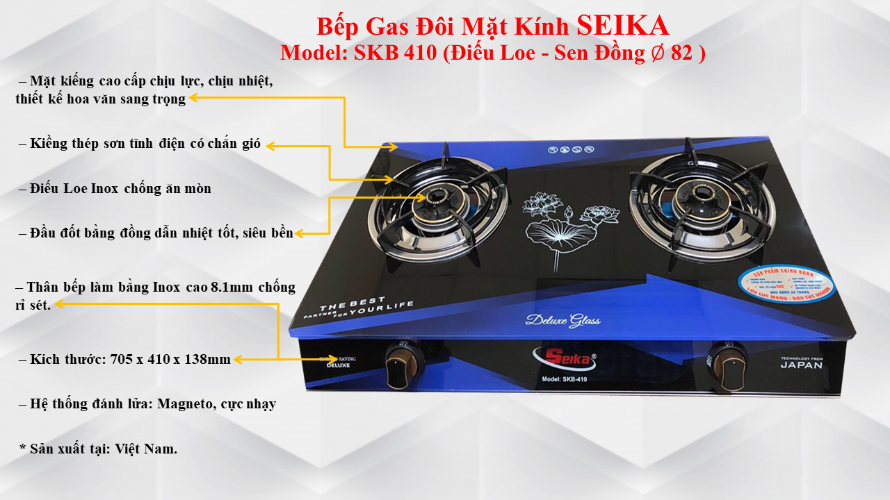 Bếp Gas Đôi Mặt Kính Seika(Sen Đồng)- Mặt kiếng cao cấp chịu lực, chịu nhiệt, thiết kế hoa văn sang trọng - Thân bếp làm bằng inox chống rỉ sét. - Kiềng thép sơn tĩnh