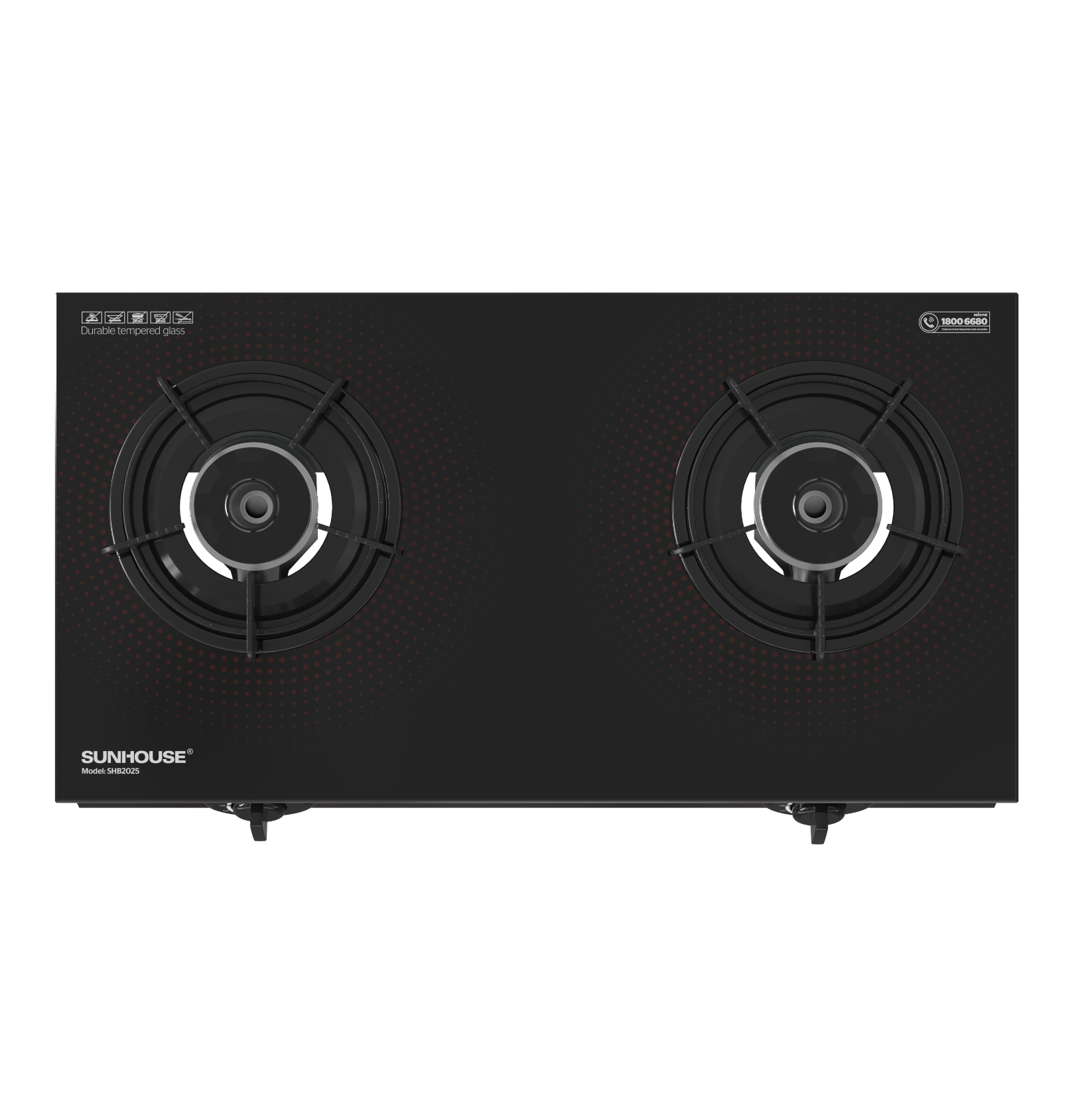 Bếp gas dương kính SUNHOUSE SHB2025 có 2 vùng đun, điều khiển lửa to, nhỏ bằng núm vặn tiện lợi, chế biến được nhiều món ăn cùng lúc. Mặt kính với gam màu đen trang nhã, sang trọng kết hợp cùng hoạ tiết kẻ sọc tinh tế.