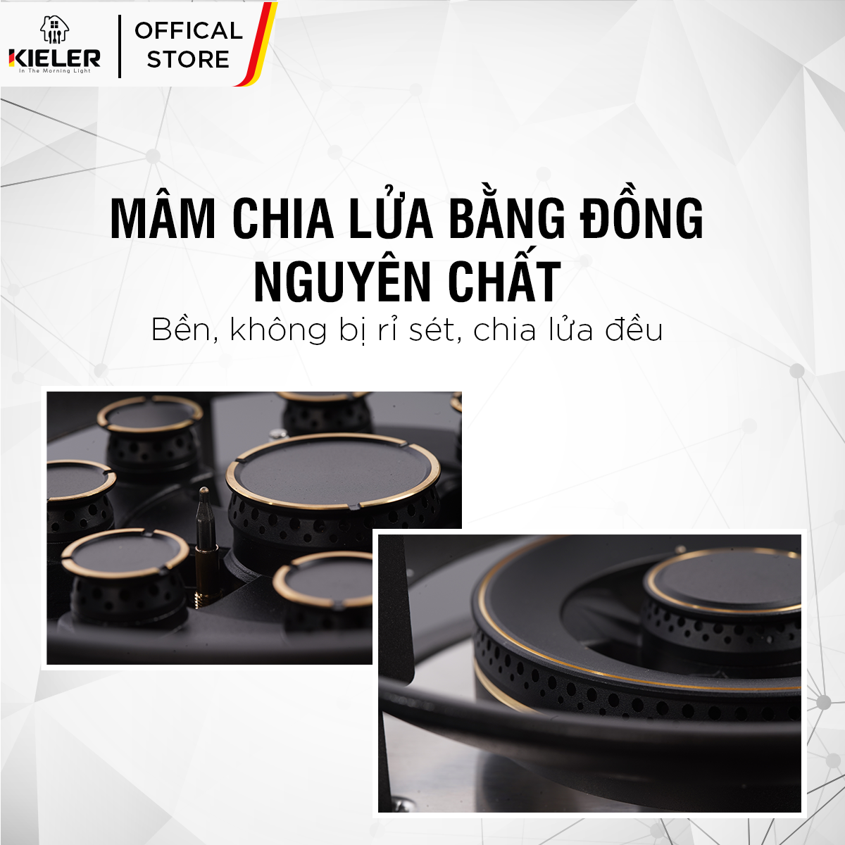 * Mặt kiếng cao cấp chịu lực, chịu nhiệt, thiết kế hoa văn sang trọng; - Thân bếp làm bằng inox chống rỉ sét, cao 60mm; - Núm vặn kiểu Rinnai; - Kiềng thép sơn