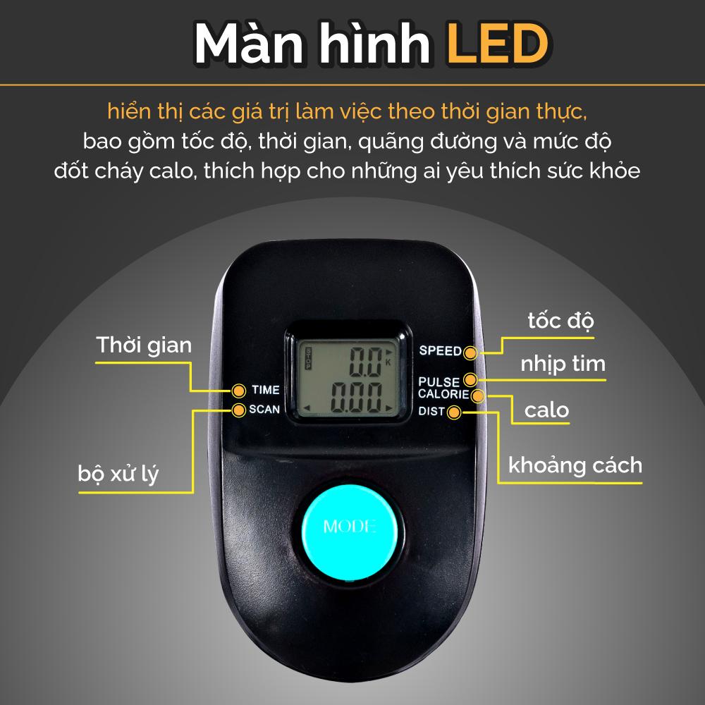 • Màn hình LCD đa năng: Thông qua nút MODE thì người sử dụng có thể sử dụng để đo nhịp tim, lượng calo tiêu thụ, quãng đường di chuyển, thời gian luyện tập, tốc độ dừng, tổng quát