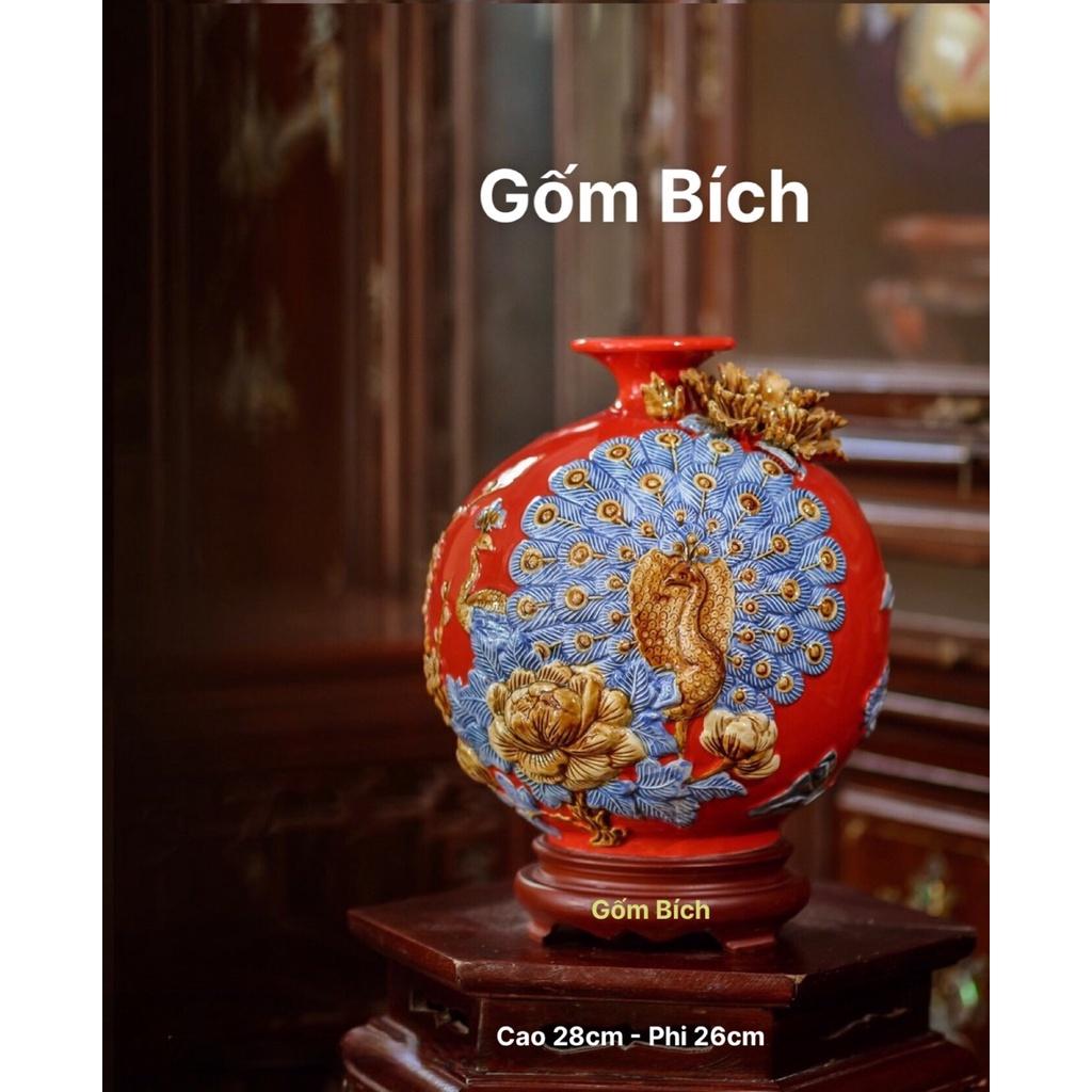 Lọ Lộc Bình Men Rạn Đắp Nổi được làm thủ công bởi bàn tay nghệ sĩ của những nghệ nhân làng gốm Bát Tràng Kích thước: Chiều cao 36cm Phù hợp với những ban thờ