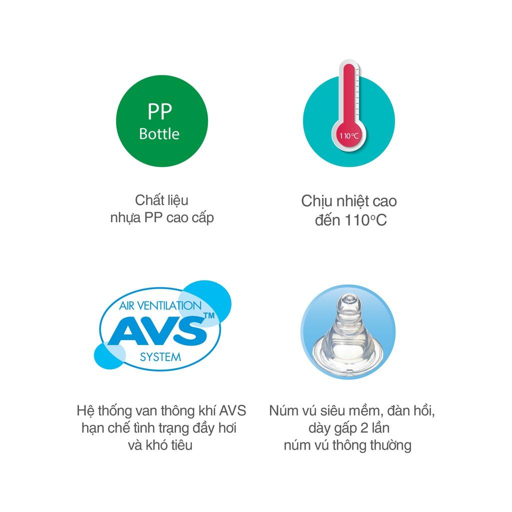 - Bình sữa nhựa cổ rộng nhựa PP : 270ml & 360ml - Bình sữa được làm từ chất liệu nhựa PP cao cấp, nhẹ, bền, không chứa BPA, khả năng chịu nhiệt đến 110°C;