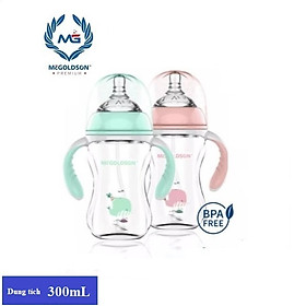 Bình sữa cổ rộng McGoldson có ống dẫn sữa làm từ silicone chịu được nhiệt độ cao, đầu bên trong bình có đáy nặng giúp bé dễ dàng bú sữa ở mọi tư thế.