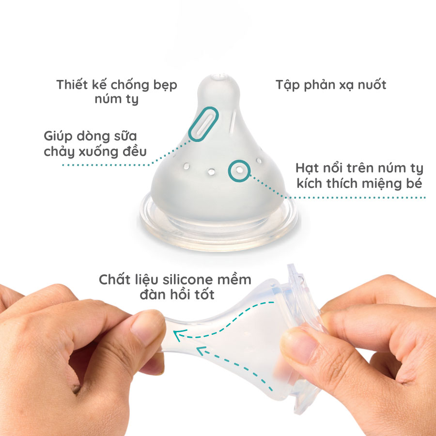 Các vân nổi được thiết kế trên núm ty có hình dạng giúp sữa chảy xuống đều, hạn chế tối đa tình trạng bé nuốt phải không khí gây đầy hơi, ọc sữa. Các hạt nổi trên núm ty giúp kích thích miệng bé bú.