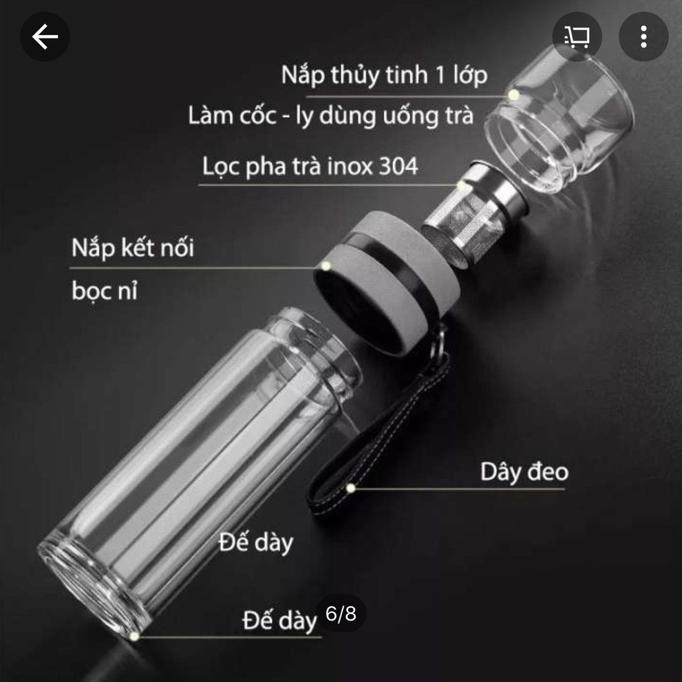 • Bao gồm: 01 bình thủy tinh 2 lớp, 01 nắp thủy tinh (kiêm cốc uống nước luôn), 01 ngăn lọc trà inox 304 không rỉ.