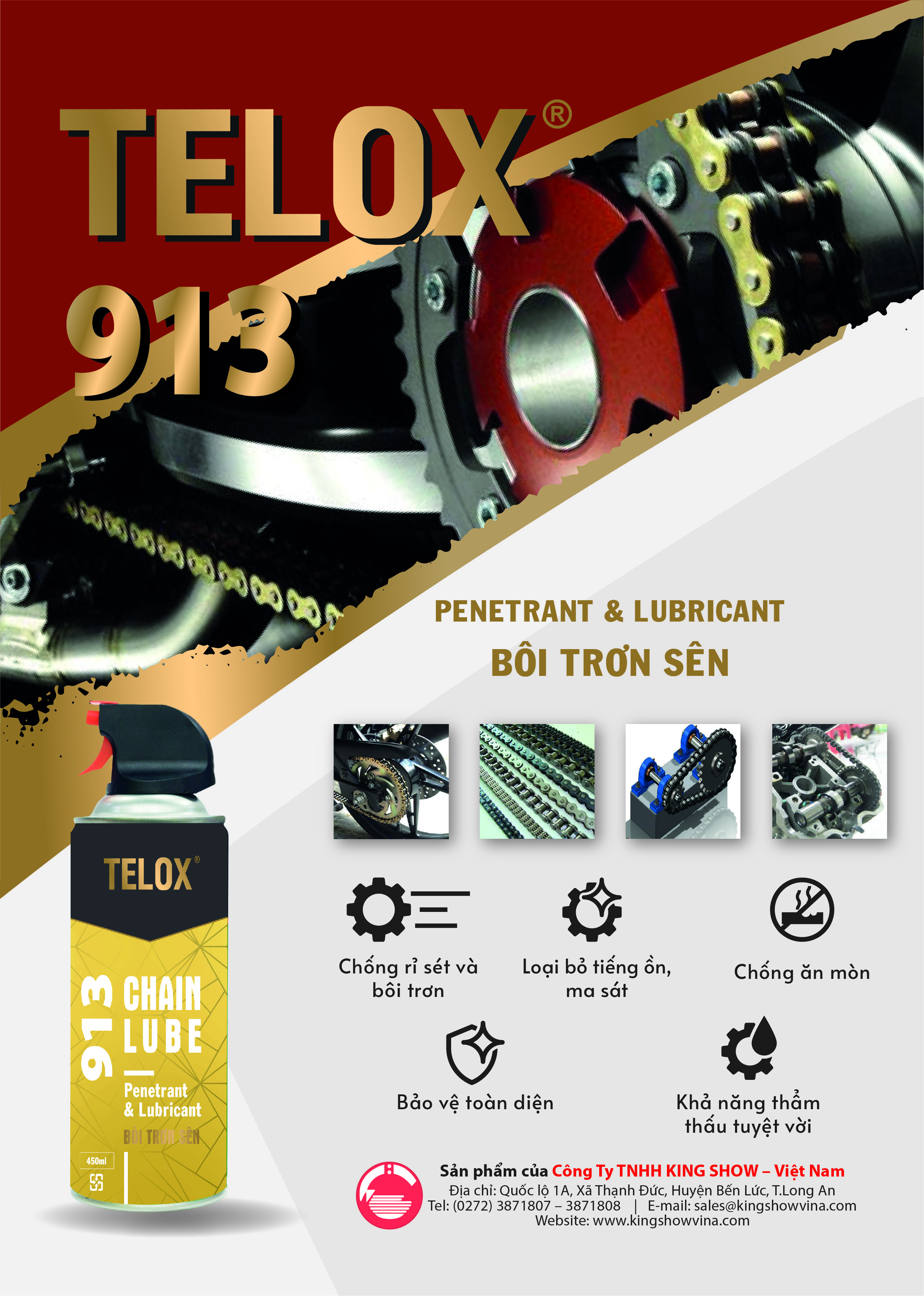 Dầu bôi trơn xích-sên xe máy Telox 913 450ml - Telox Chain lube 913 450ml Đặc tính sử dụng: - Đặc biệt dành cho dây xích, bánh răng và vòng bi - Khả năng thẩm